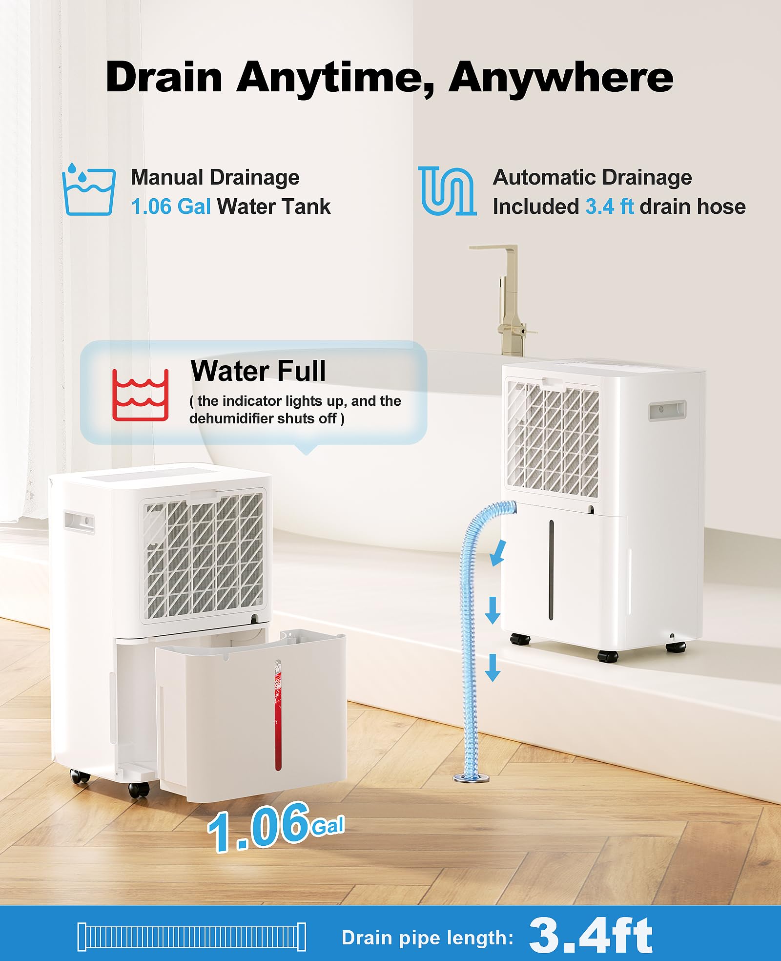 - 2 Ways Drainage with 1.06 Gallon Tank: Customize your dehumidification with our basement dehumidifier's 2 drainage options. It has a 1.06-gallon (4L) tank that shuts off automatically when full to prevent overflow. Alternatively, connect a drain hose for uninterrupted operation. Enjoy the convenience of versatile drainage choices