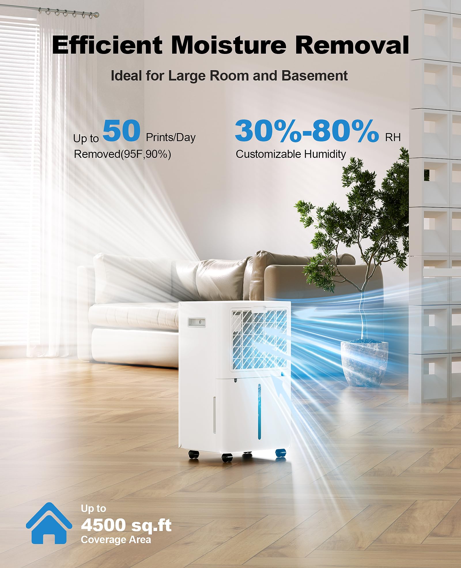 - High-Efficiency Dehumidification: Lienuis home dehumidifier is your key to living in the perfect humidity zone.. Equipped with a built-in high-efficiency condensing compressor, the basement dehumidifier can remove up to 50 pints of moisture daily ( 95°F, 90% RH ), adjust humidity range from 30% to 80%. It can adjust humidity from 30% - 80% and is suitable for damp basements, bedroom, bathroom,home, offices, crawlspaces, covering up to 4500 sq ft. High Efficiency Dehumidification Made Easy with Lienuis