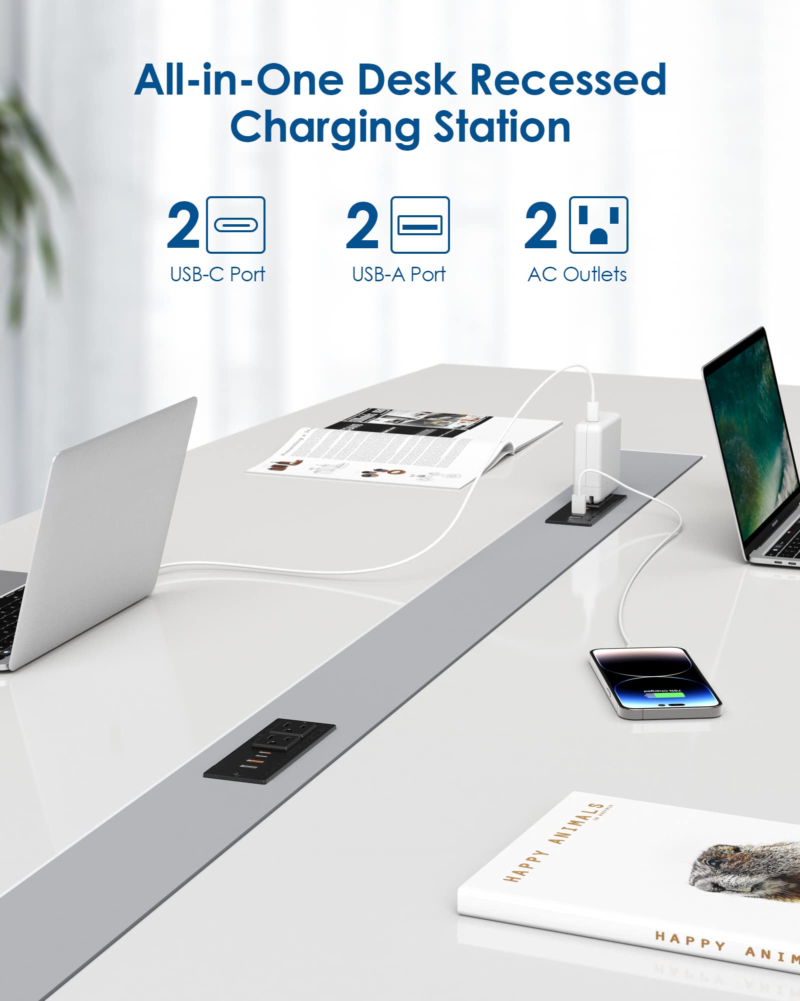 45W USB C Recessed Power Strip,Flush Mount Desk Recessed Outlet,Space-Saver for Furniture Side Table,2 USB-C &2 USB-A Ports,2 AC Outlets,6ft Cord,Ultra Thin Flat Plug