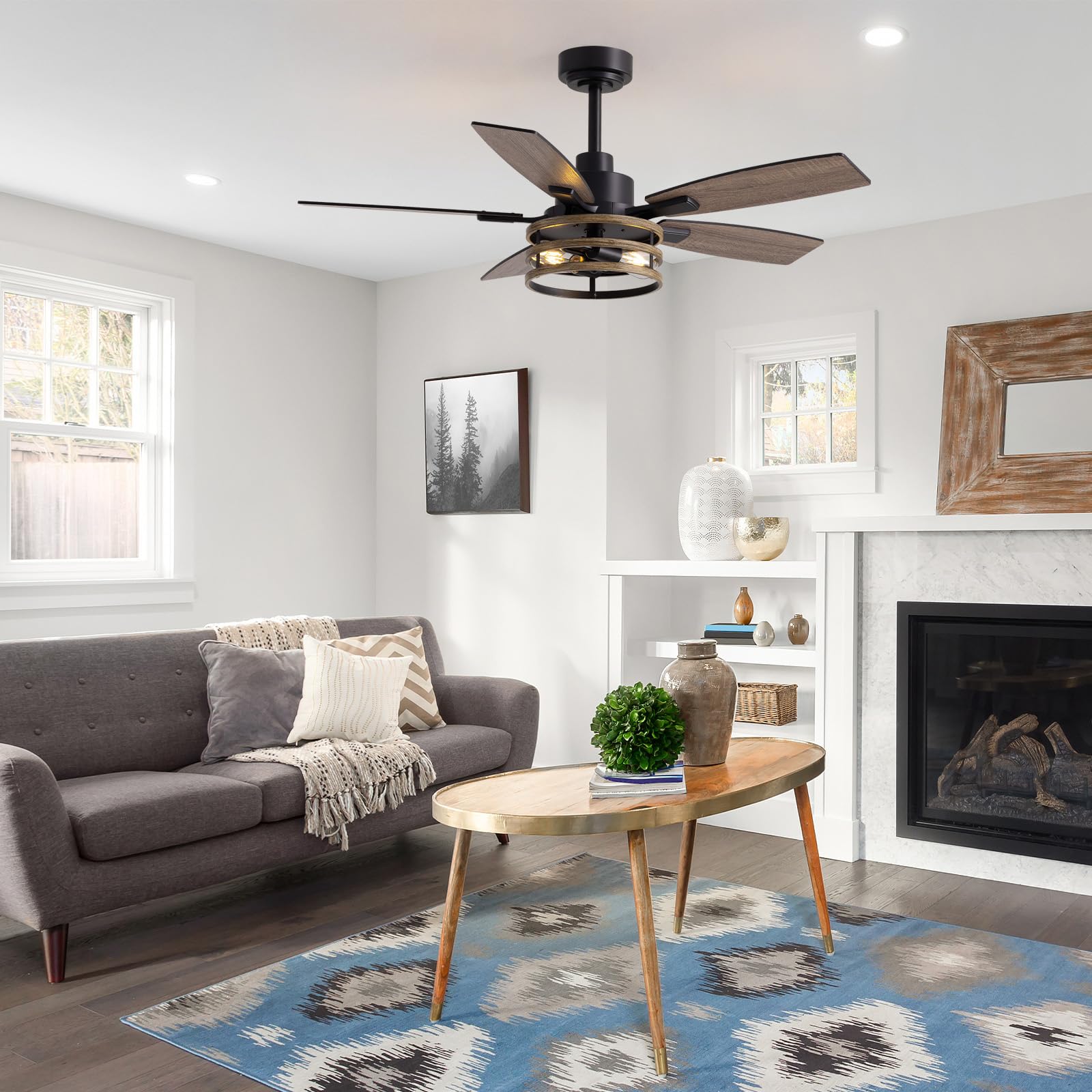 - Two Blades Optional:46 inch caged ceiling fan is a modern design with 5 blades and double-color blade finish (walnut and black wood grain color ), which can be flipped and installed according to personal preference.Perfect for any indoor space and covered patio use.