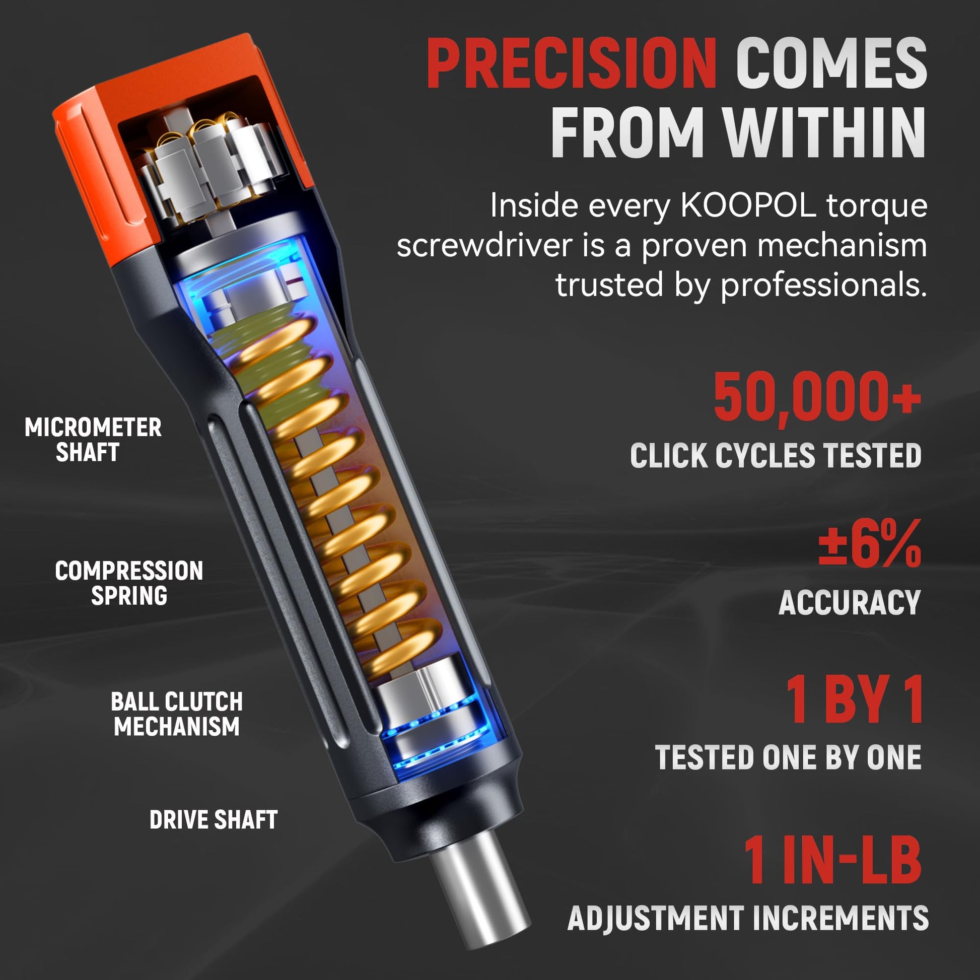- 【Unmatched Precision You Can Trust】 Engineered for tasks where precision matters most — from gunsmithing and scope mounting to securing electrical switch plates.This adjustable torque screwdriver delivers a true 10–70 in-lbs range in 1 in-lb steps, factory-calibrated to ±2 in-lbs and tested over 50,000 click cycles for reliable, repeatable performance — without over-torquing or damage.