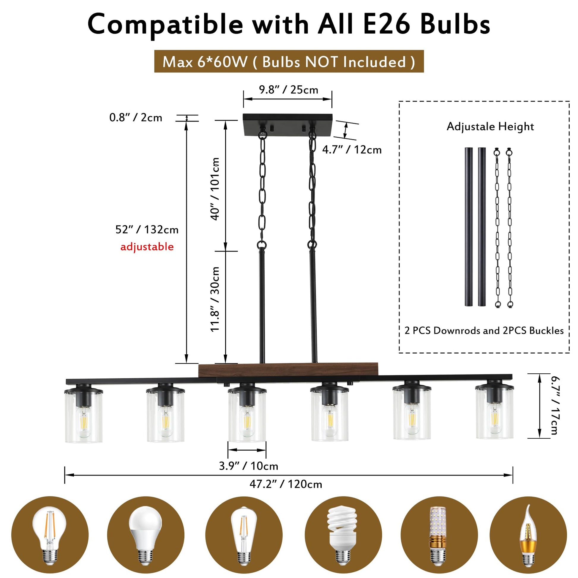 - E26 Bulb Base: This dining room pendant light needs 6 E26 bulbs, and the maximum power is 60W. Compatible with CFL bulb, halogen, incandescent and vintage edison bulbs, Enjoy dimmable lighting with compatible bulbs and a compatible dimmer switch. Please note: Bulbs and dimmer switch are not included.