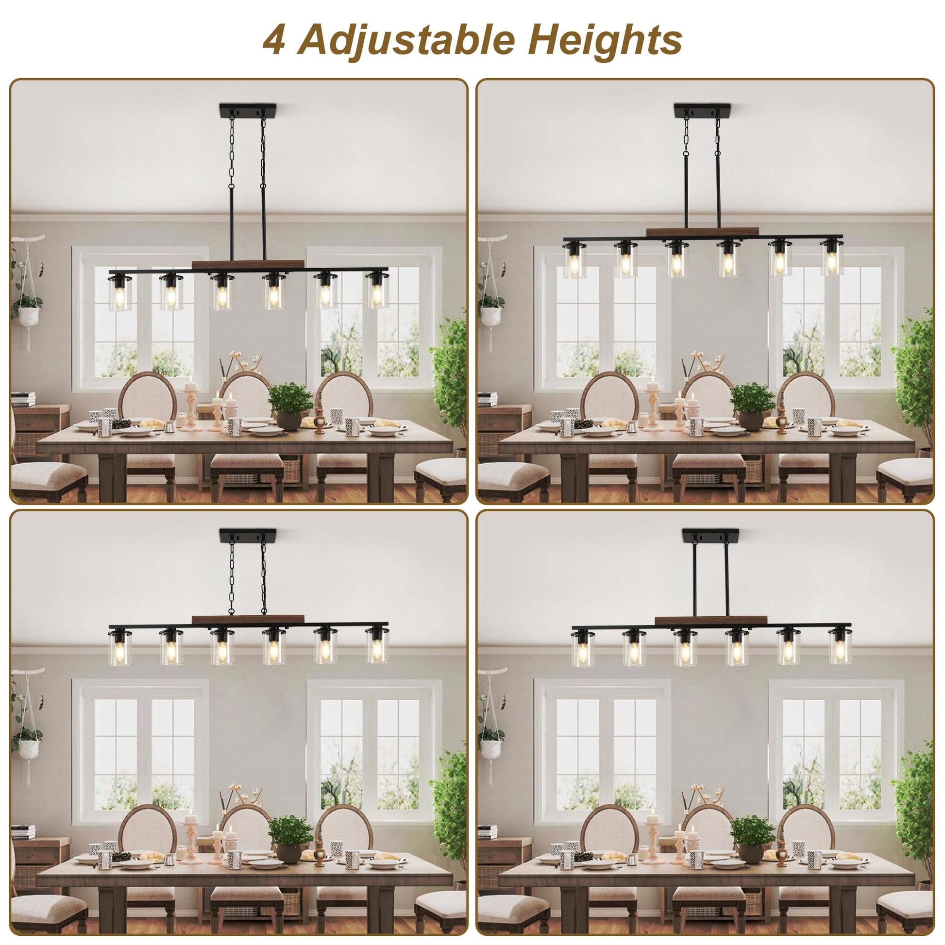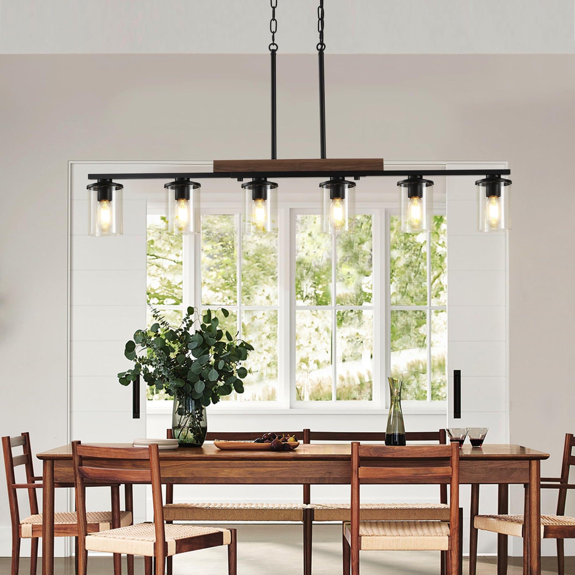 47.2'' Kitchen Island Light Fixtures, 6-Light Dining Room Light Fixture Chandelier Over Table, Black Modern Rustic Wood Ceiling Pendant Light Fixtures, with Clear Glass Shade, Farmhouse Chandelier