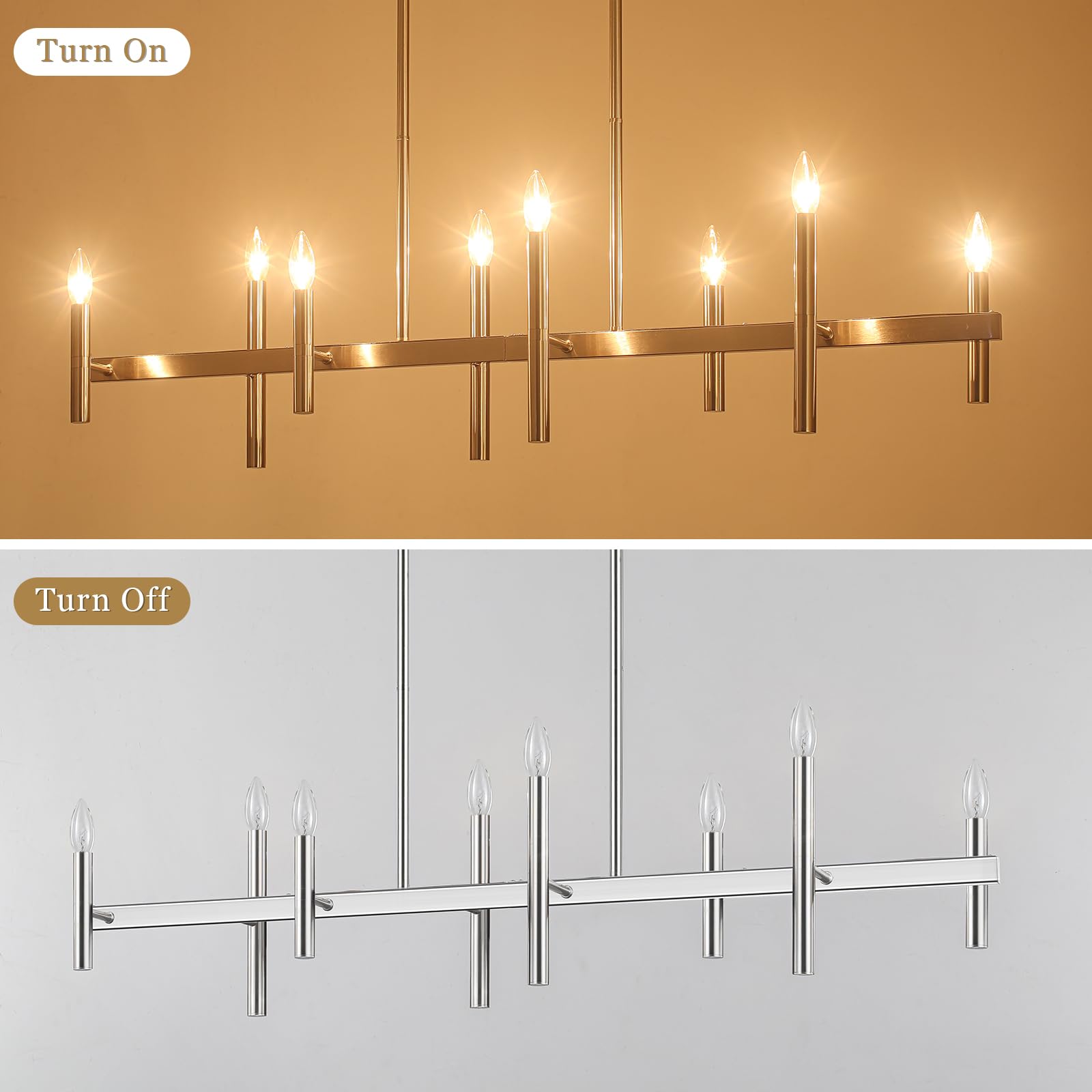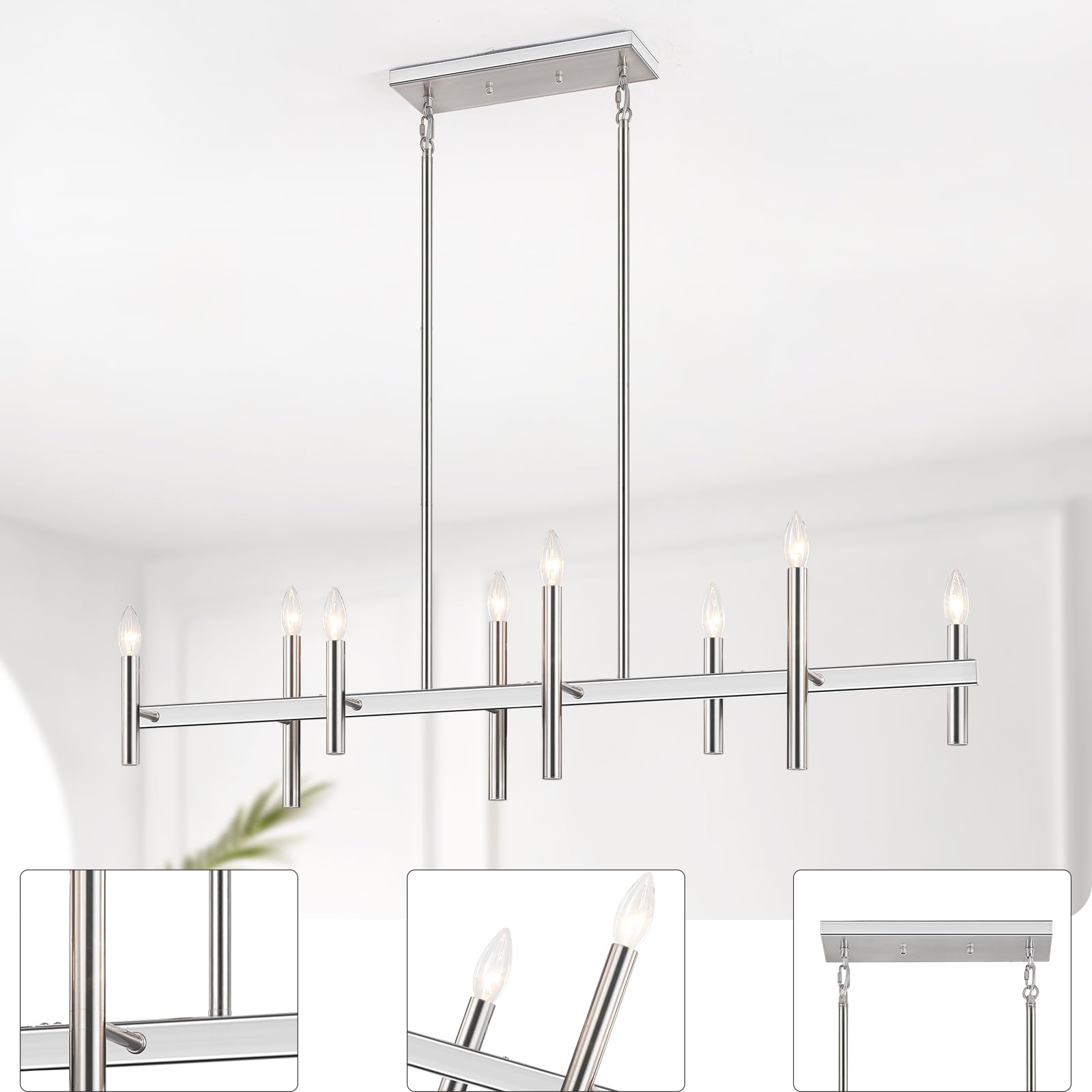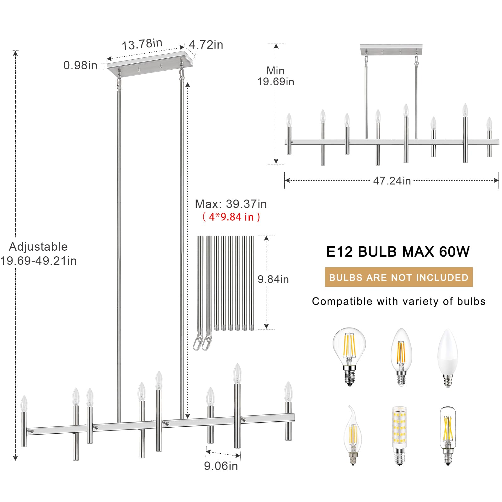 - 【Bulb Requirement & Dimmable】This brushed nickel light fixtures for dining room ceiling is compatible with various types of 8 x E12 base bulbs(MAX 60w per blub), options include incandescent, led, halogen, Edison, cfl, etc (Bulbs Are Not Included). This farmhouse dining room lighting is dimmable if working with dimmable bulbs and compatible dimmer switch(Not Included Also).