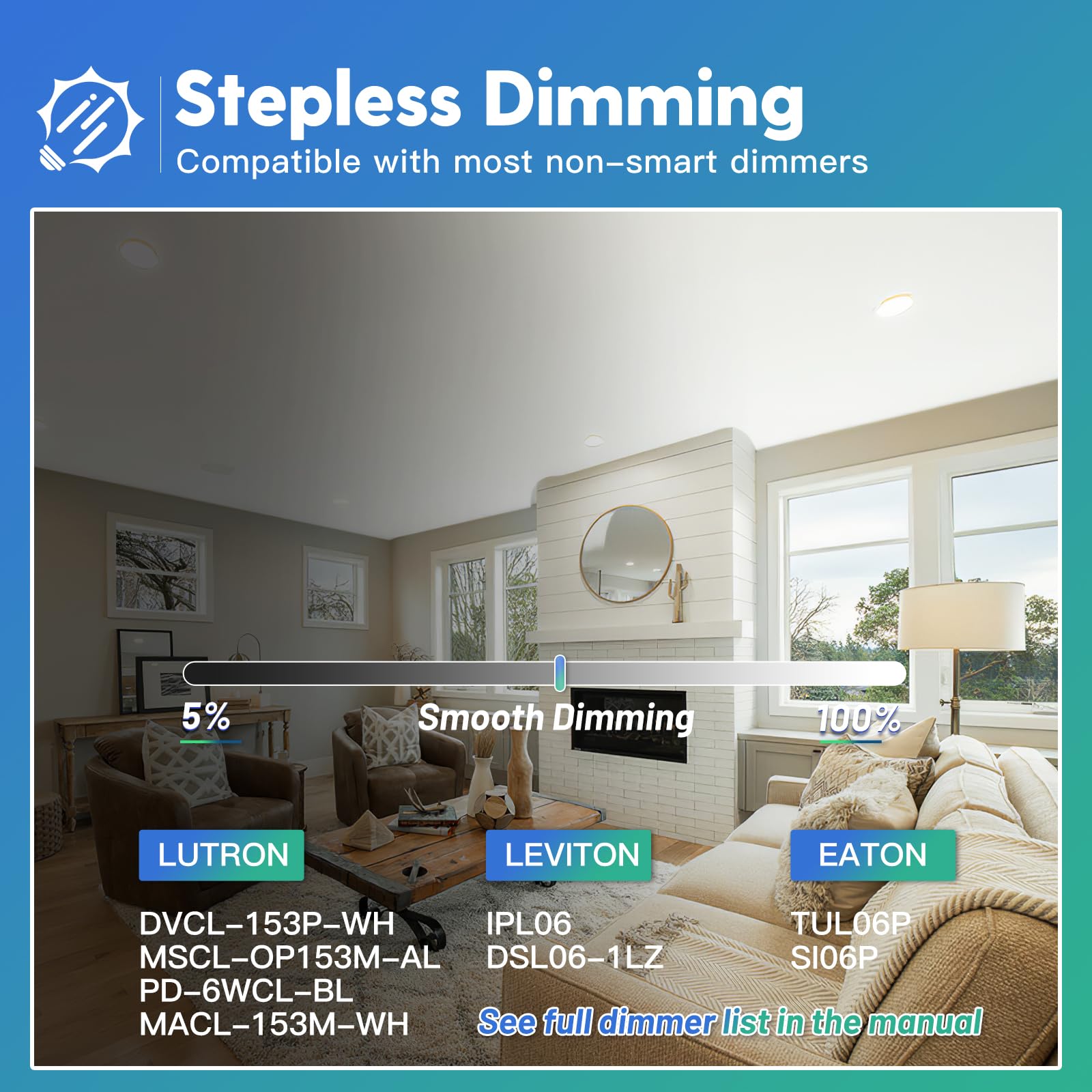 - Wide Application: Ultra-thin body, 5%-100% smooth dimming, compatible with most dimmers, suitable for damp location, meets kinds of needs in applications such as kitchen, living room, bedroom, bathroom, workplace, common areas, outside soffits and other hard to reach spaces.