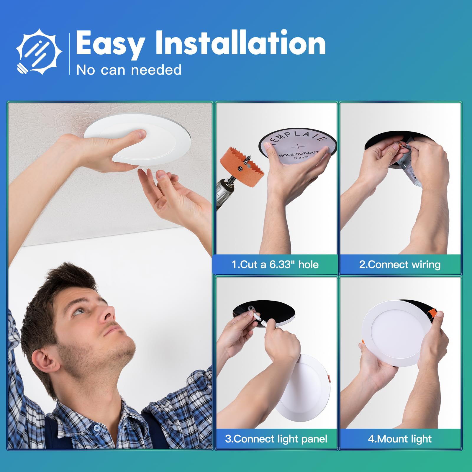 - Easy Installation: The low profile recessed lighting is suitable for retrofit and new decoration. And the installation can be completed in minutes. It only requires as small as 2 inches ceiling spaces, fits various ceilings, and joists. Recessed can is no longer a limitation for your choice.