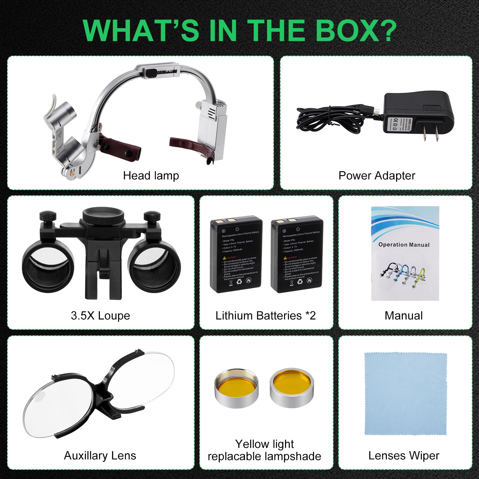 4E 4E'S USA Head-Mounted Dental Loupes with Light 3.5X 420mm, Dual Rechargeable Batteries, Ergonomic Design, Clear Vision & Comfort - Silver