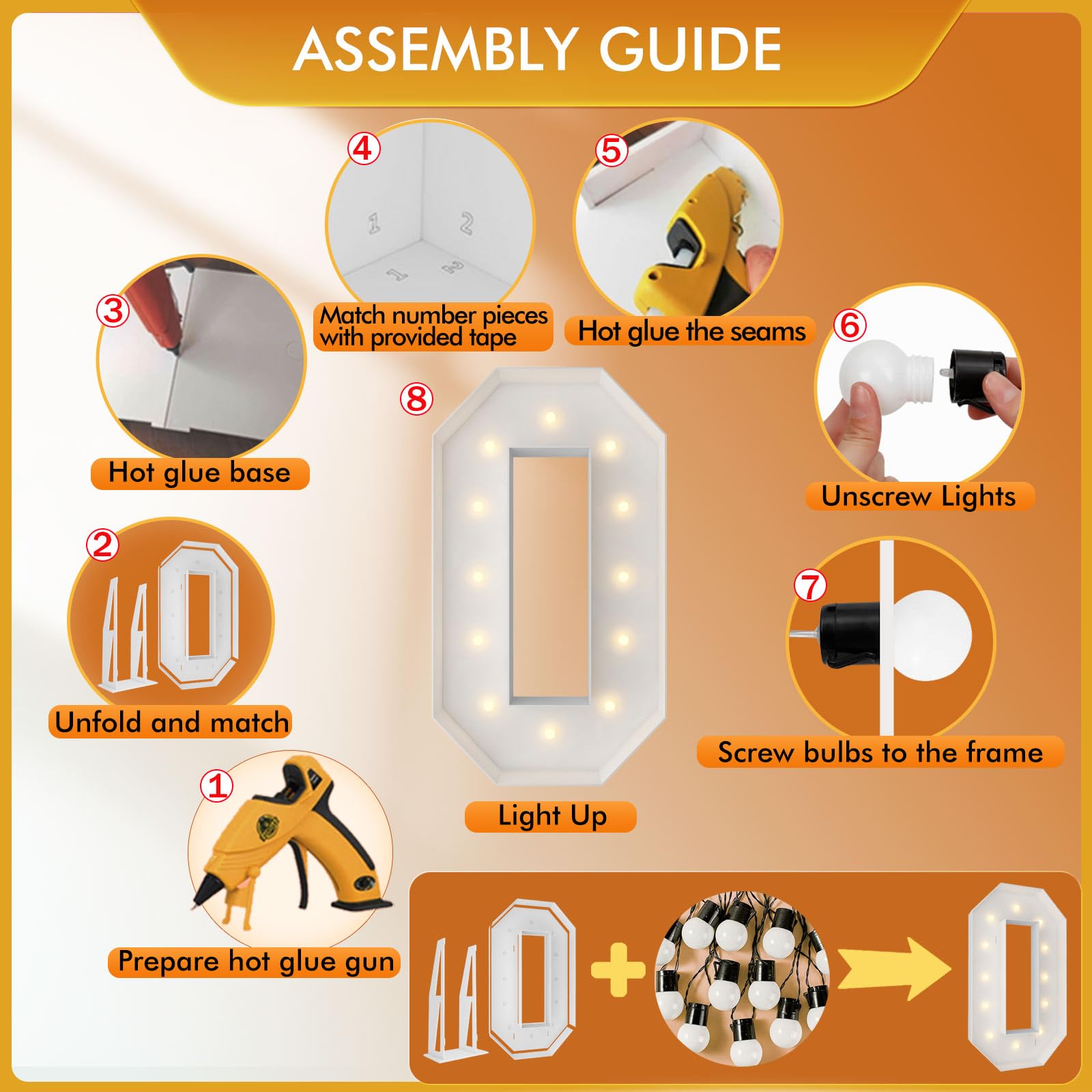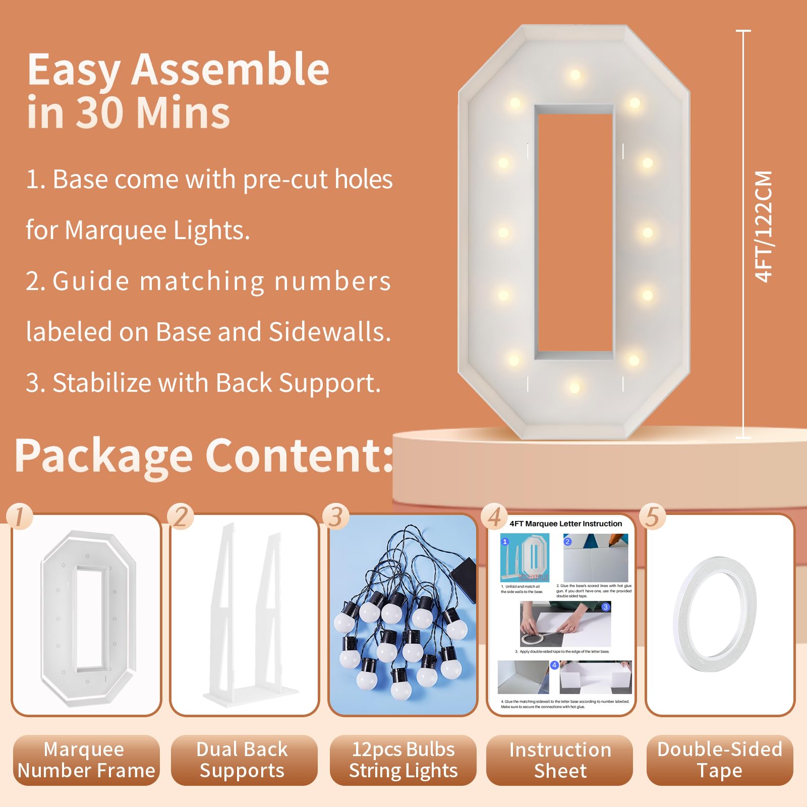 - 【Easy To Assemble】Our 4FT marquee letters frame are made of sturdy Foam boards with numbered side walls for easy setup. Use the included double-sided tape to secure the frame, or a hot glue gun(Not Include) for added reinforcement. Installation takes just 30 minutes following the instruction manual. The kit includes a 4ft number sculpture, side walls, dual back support, double-sided tape, and instruction manual.