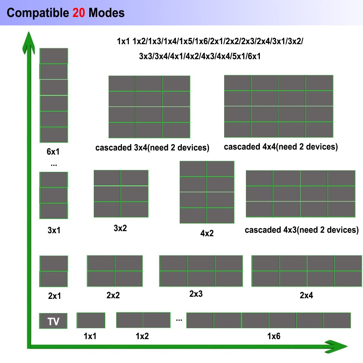- [VARIOUS MODES] This Video Processor Supports A Variety of Splicing Modes:1x1 1X2 1X3 1X4 1X5 1X6 2X1 3X1 4X1 5X1 6X1 2X2 2X3 2X4 3X2 3X3 4X2, And Use Two Devices to Cascade Mode - 3x4 4x3 4x4