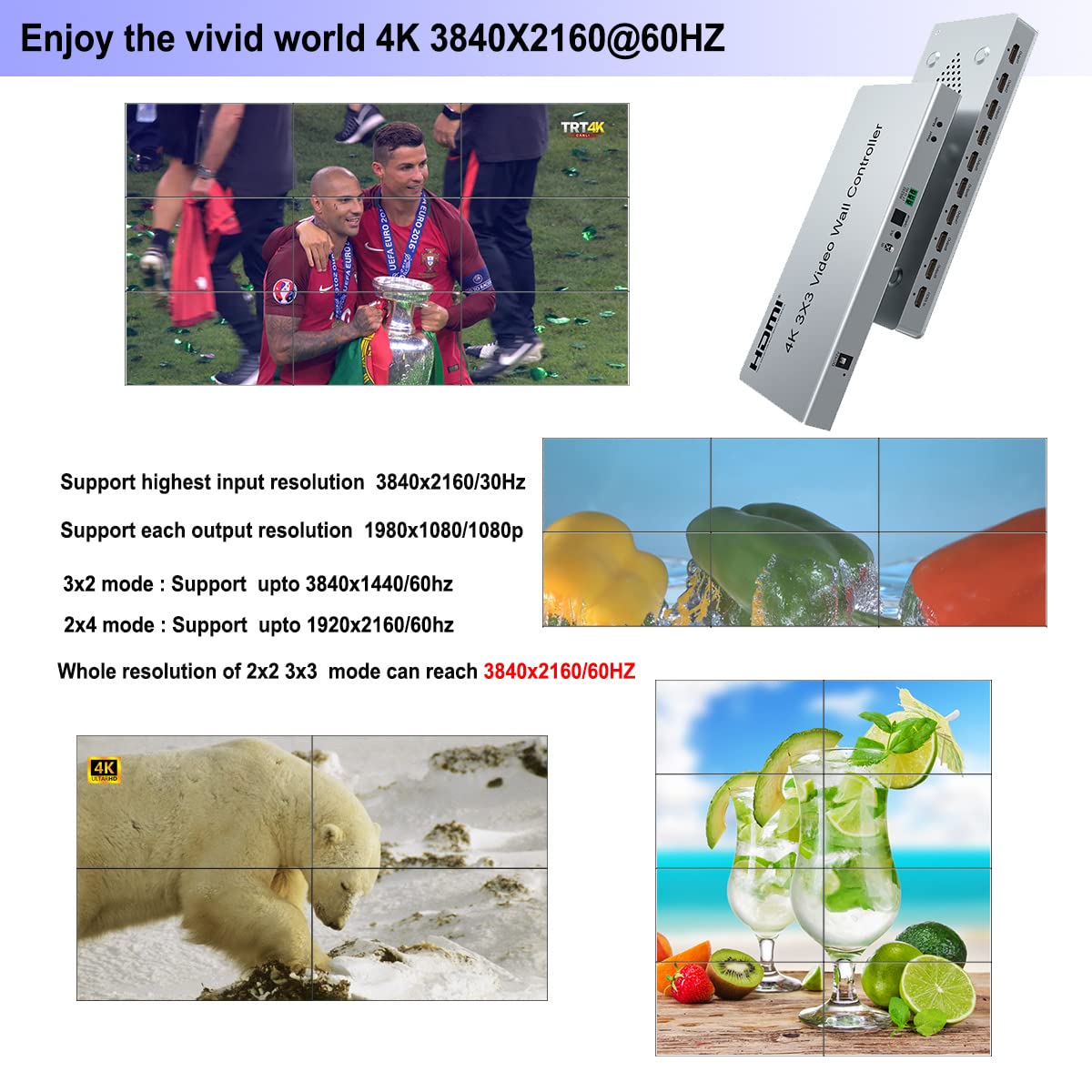 - [HIGH DEFINITION] This Video Wall Controller Support Input Video Resolutions: 4K@/30Hz, 1080p @ 25/30/50/60HZ, 1080i @ 50/60Hz (For Direct TV and Other Broadcast Satellites); Output Resolution: 1080p @ 60Hz (in each display)(Totally Resolution Can Reach 3840x2160/60HZ).