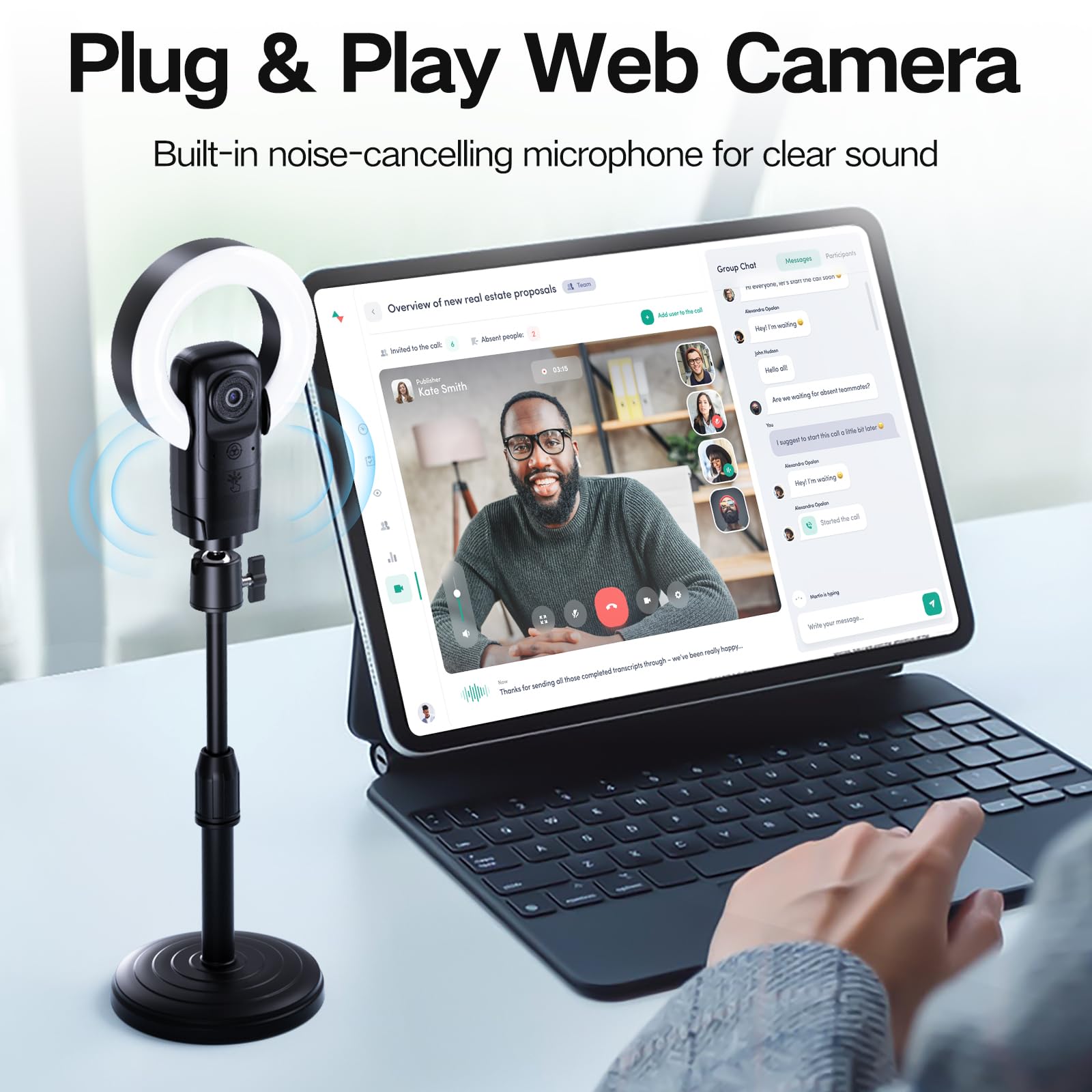 4K Webcam with Light, Webcam for PC with Microphone, Plug and Play, USB Computer Camera for Desktop, Auto-Focus, Web Camera for Desktop Computer Zoom Skype