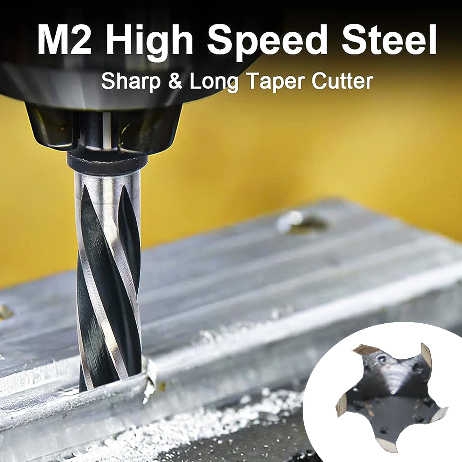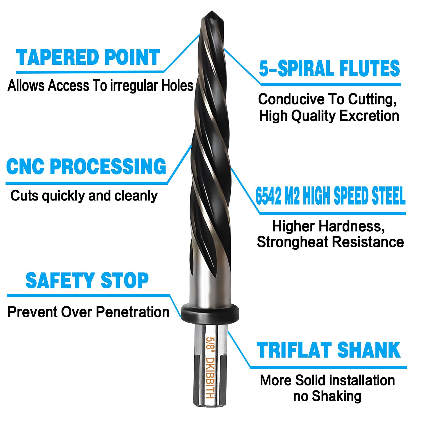- Special Features – The 5/8inch reamer bit features a 1/2" Round Shank with 3-Sides, a Tapered Point, and a Safe Stop, ensuring a firm grip in the chuck, allowing it to enter imperfect holes to ream steadily, and stopping the drill safely when the hole is complete.