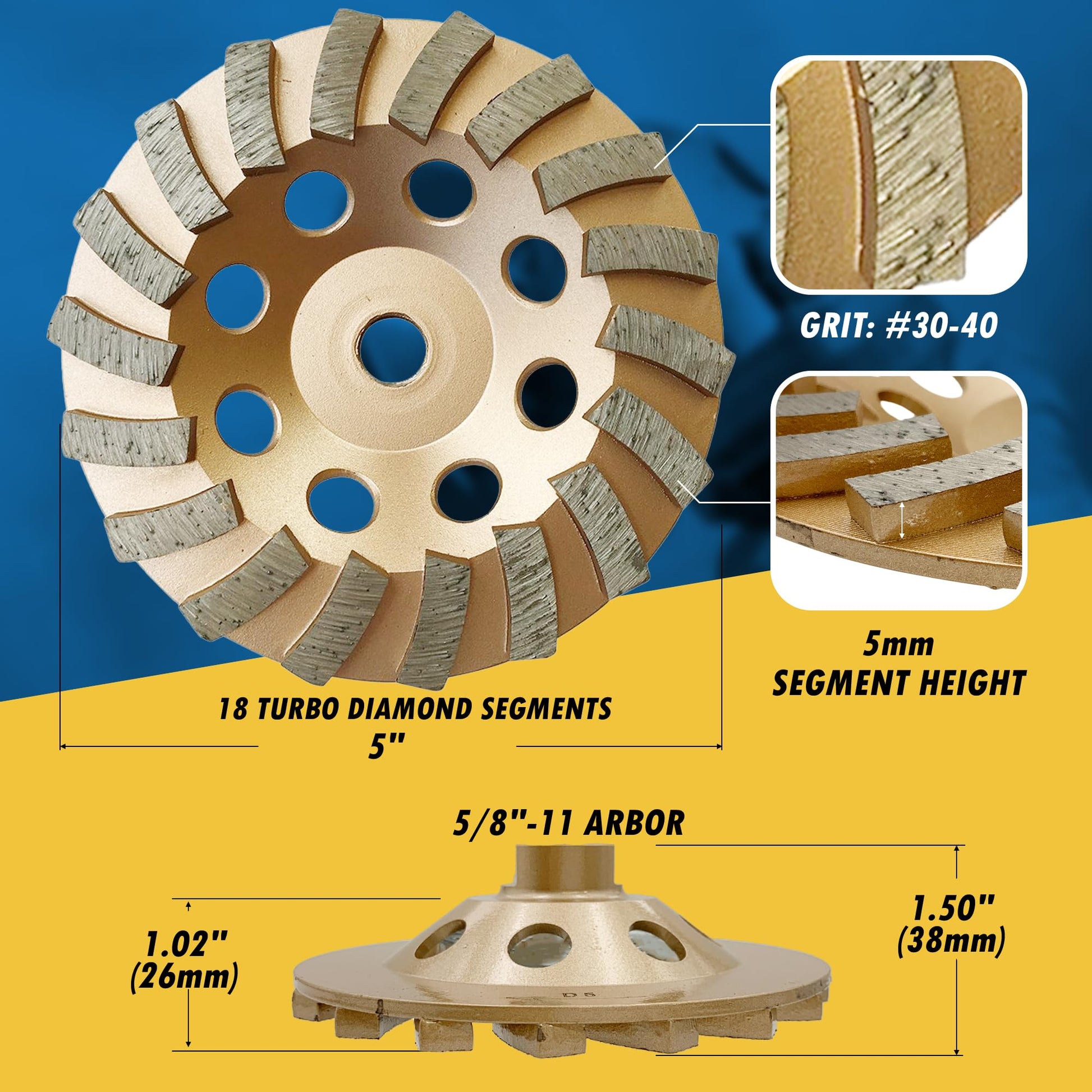 5" Diamond Grinding Wheels for Concrete or Masonry, 18 Turbo Segments, #30/40 Grit, Medium Bond, 5/8"-11 Arbor