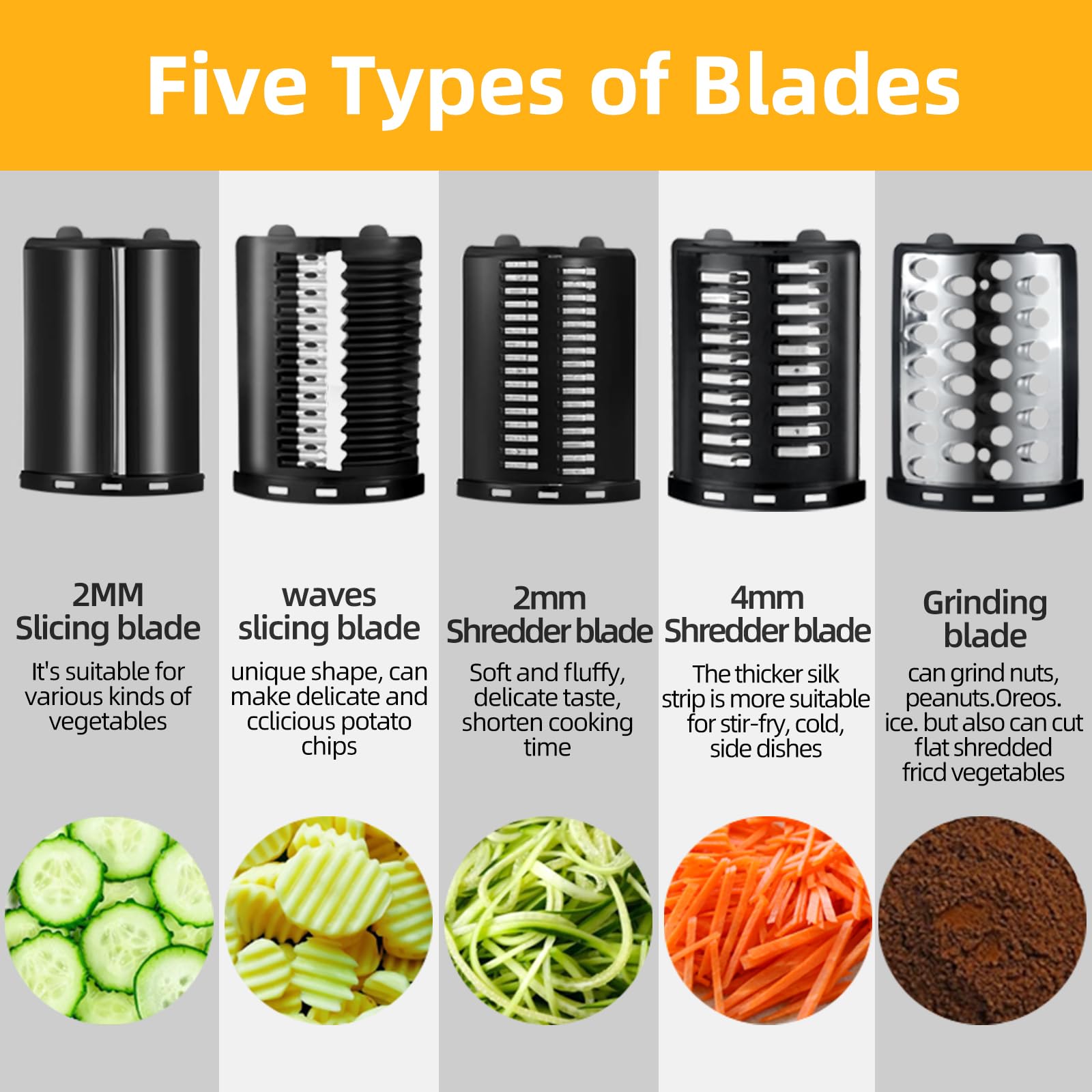 - 【5-in-1 Multi-Functional electric vegetable slicer】 equipped with five types of blades, including coarse line blade, fine line blade, slicing blade, wavy blade and grating blade, which can satisfy your cutting needs for different ingredients.