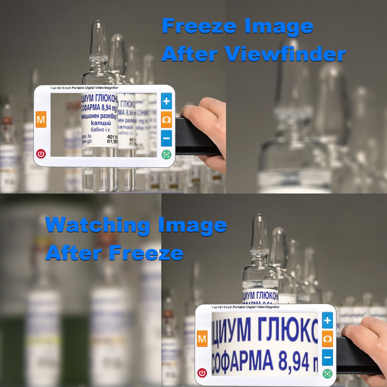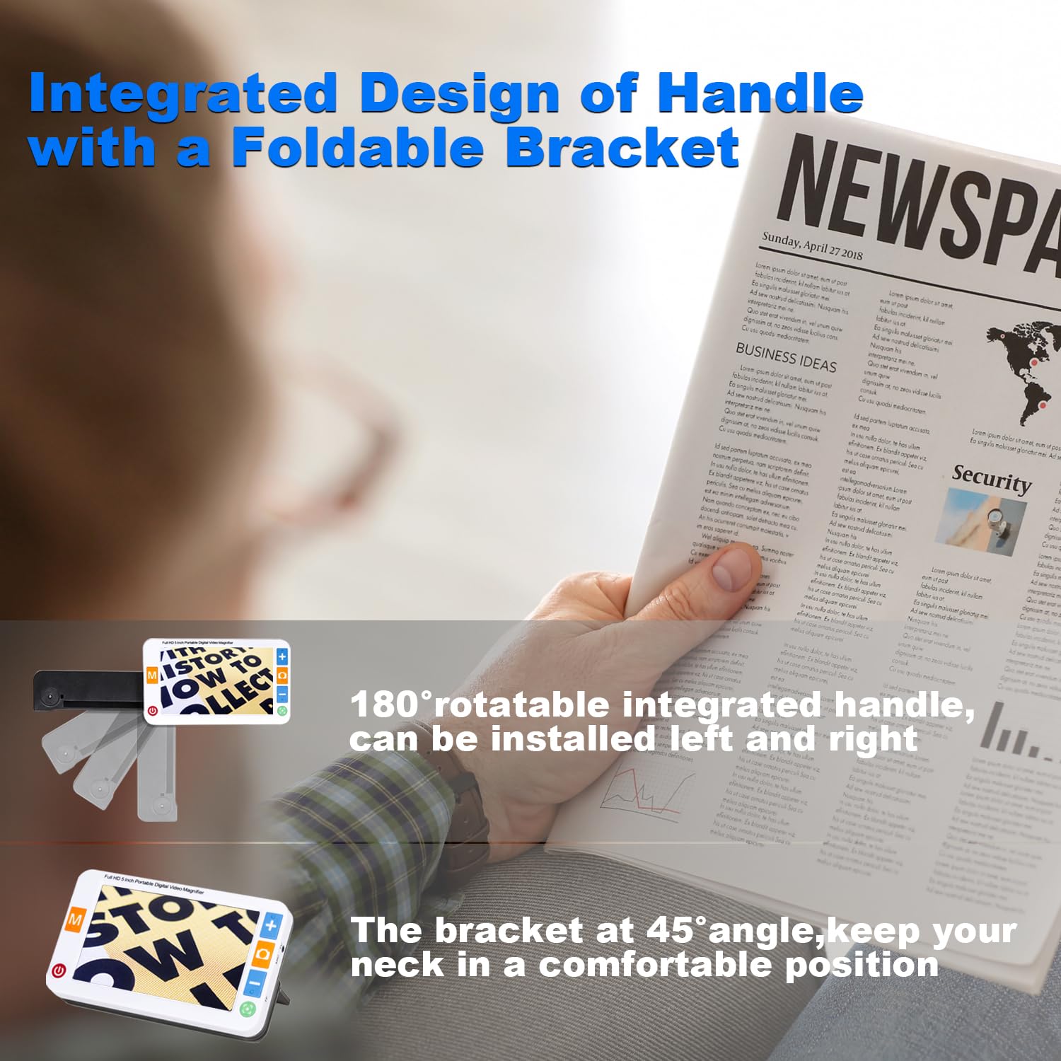 - 🌈【Ergonomic Design Handle and Bracket】Integrated design of handle and bracket, the back of the digital magnifier with a foldable bracket on the handle, it can be laid on the page at an angle so you don't need to hunch over the top to read the text. The handle also can be installed according to the habit of left and right hands.
