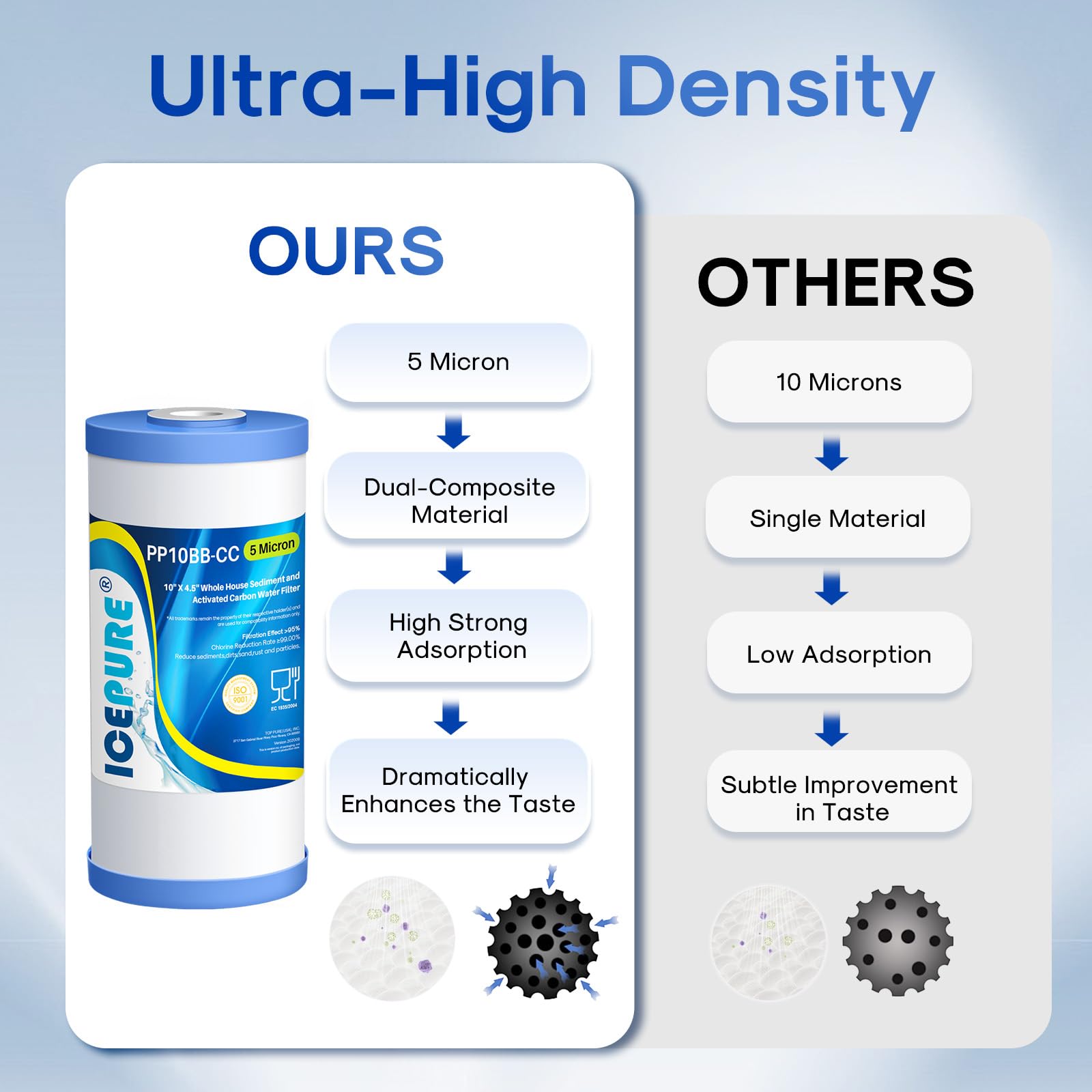 - Efficient Filtration Capacity ‒ ICEPURE Whole House Heavy Capacity Sediment and Activated Carbon Water Filters combine two filtration functions, not only reducing particles, sediment, rust, and limescale but also reducing 99% of Chlorine in water, making it taste great. [If you use well water, this filter might not work as expected. For well water solutions, please search for "B074FT4TZS."]