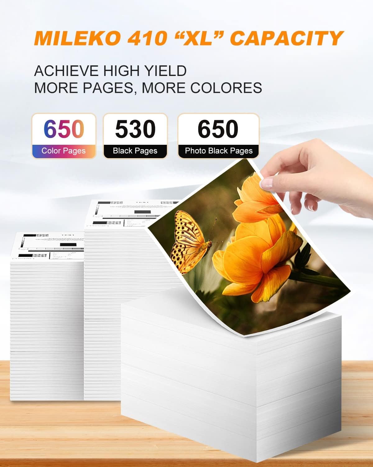 - High Pages Yield for 410xl Remanufactured for Epson 410 Ink Cartridge: 500 pages per 410xl black ink cartridge, 650 pages per 410xl color ink cartridges, 650 pages per 410xl photo black ink cartridge (at 5% coverage).