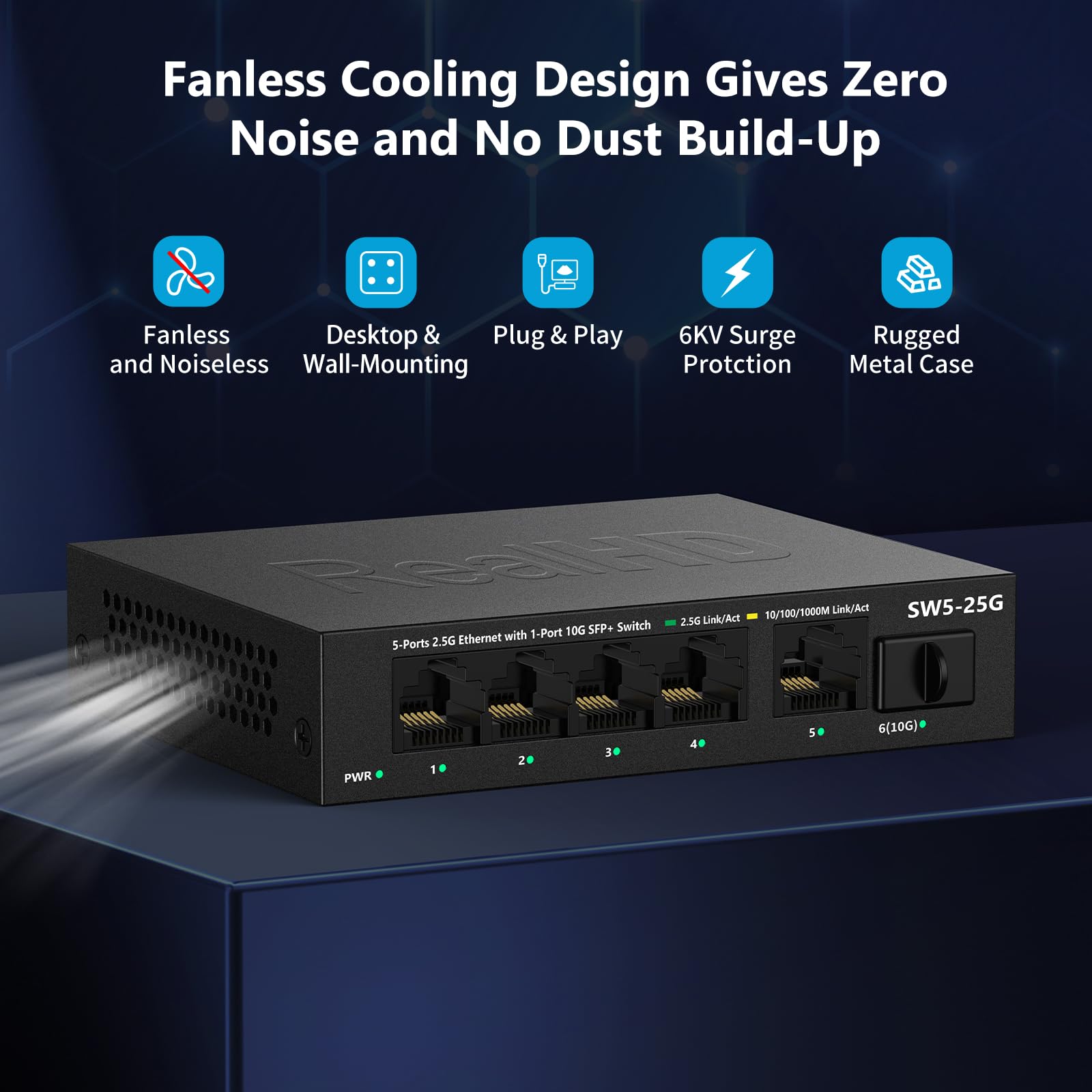 - 【Sturdy and Quiet】Compact & sturdy metal housing with 6KV lightning protection design make this 2.5 gigabit network switch safe to use in various environments. The fan-less design quietly integrates with your office environment and featured good heat dissipation, safe to use in temperatures from -20 to 50℃.