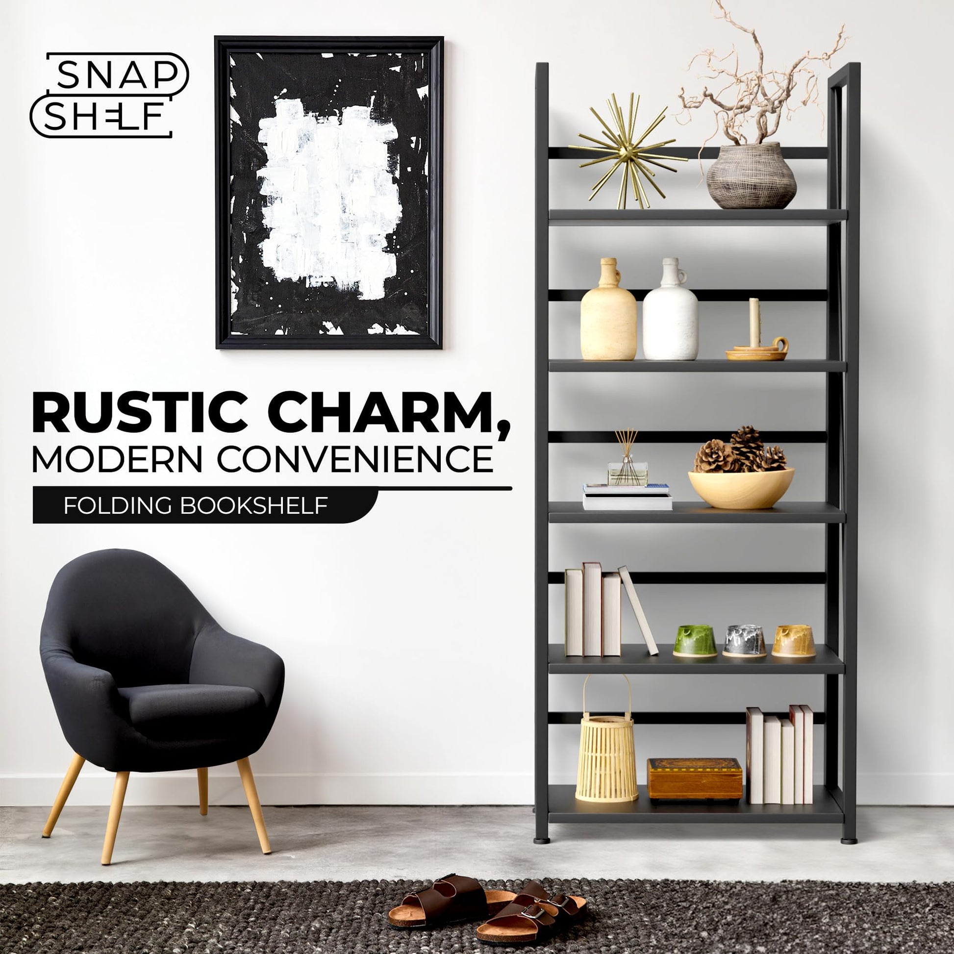 - BRING RUSTIC ELEGANCE to your living space with our collapsible bookshelf. It's the perfect addition to your office or living room, offering both function and beauty. This wood bookshelf draws the eye, creating a focal point that fills the room with warmth