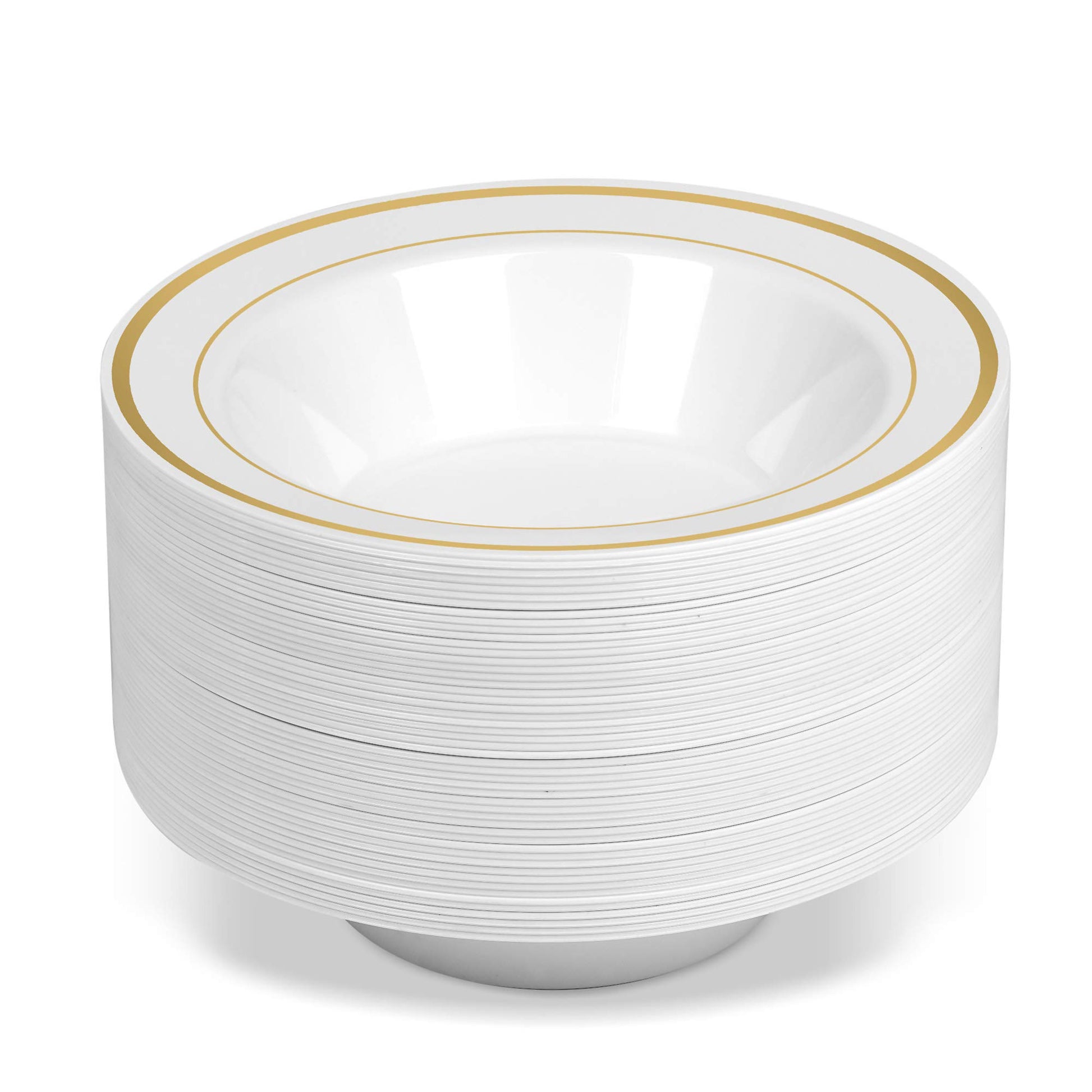 - ELEGANT DESIGN. Enhanced with an attractive gold rim, these high-gloss white bowls look like the real deal. Add an elegant, modern touch to any event with bowls that will sparkle as you wine and dine your guests.
