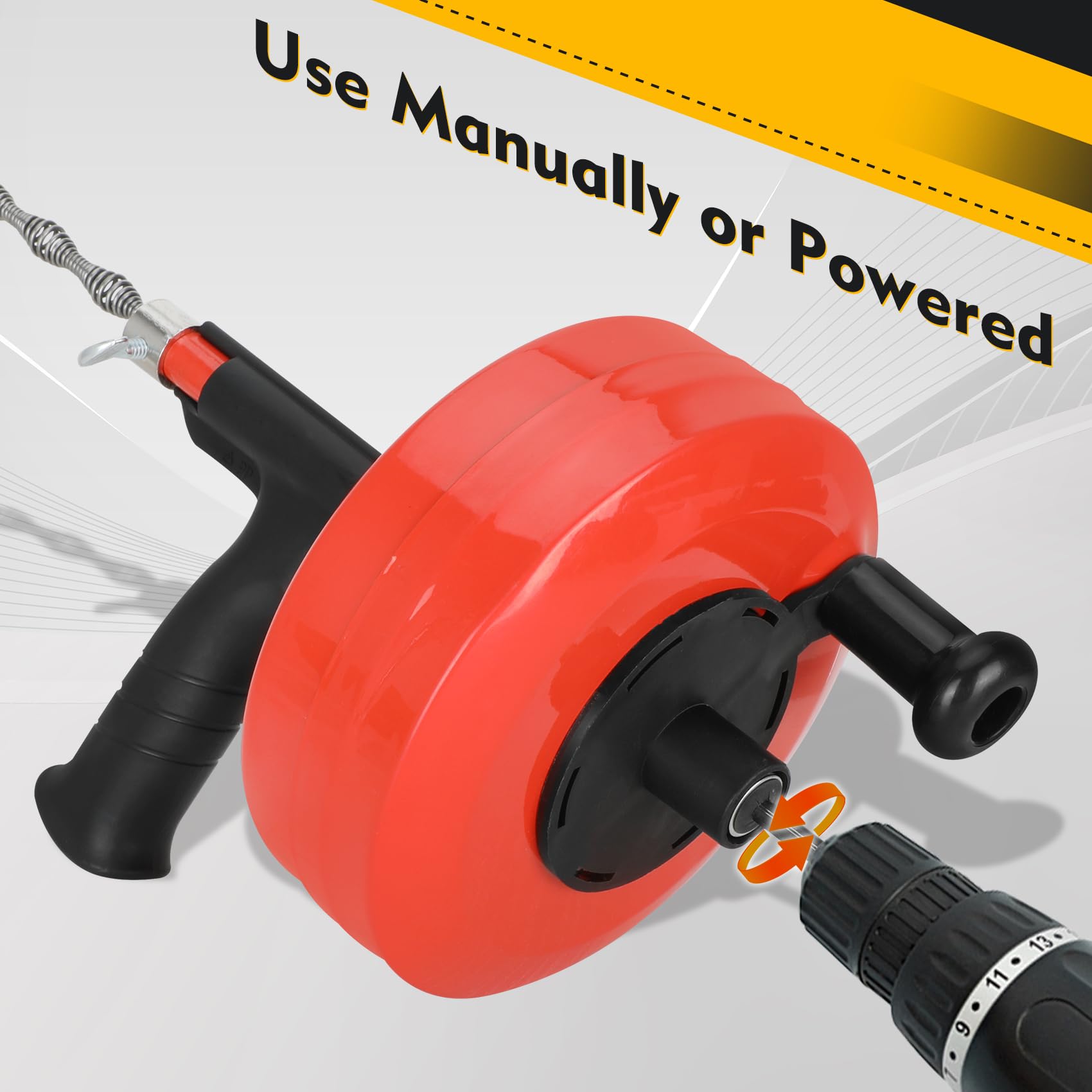 - [Use Manually or Powered] Plumbing snake use an electric drill connected to the spindle of Drum Auger, which will save more effort.Pipe unclogging is never an easy task, so please learn the tricks of the trade on the relevant video site before using it. You need to have patience to give in slowly when using it, wishing you success in unblocking!