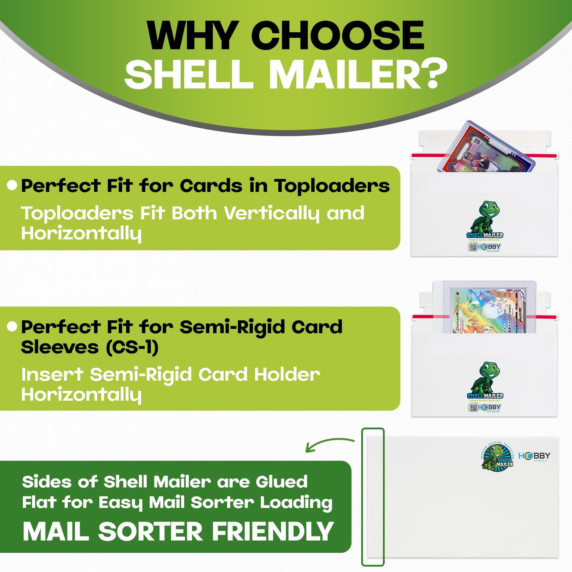 - Our trading card mailing envelopes are made of premium thin white cardboard and feature vibrant multi-color print, sure to impress your buyers! The Shell Mailer not only offers a professional look, but also streamlines your trading card business
