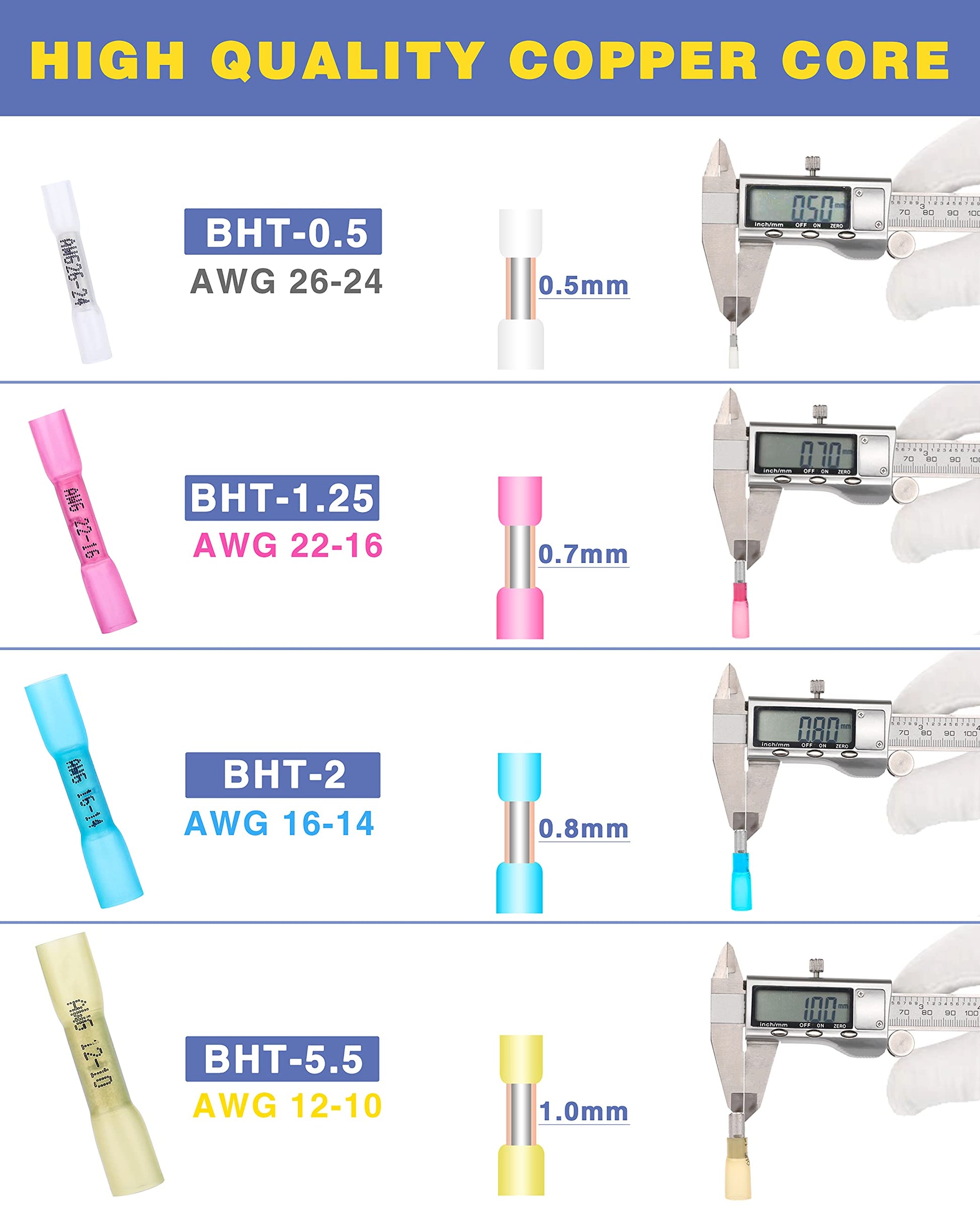 - HIGH-QUALITY COPPER CORE:Heat shrink butt connectors use a copper core with a higher thickness rating.This makes your connection project safer and better meets our customers’quality needs!