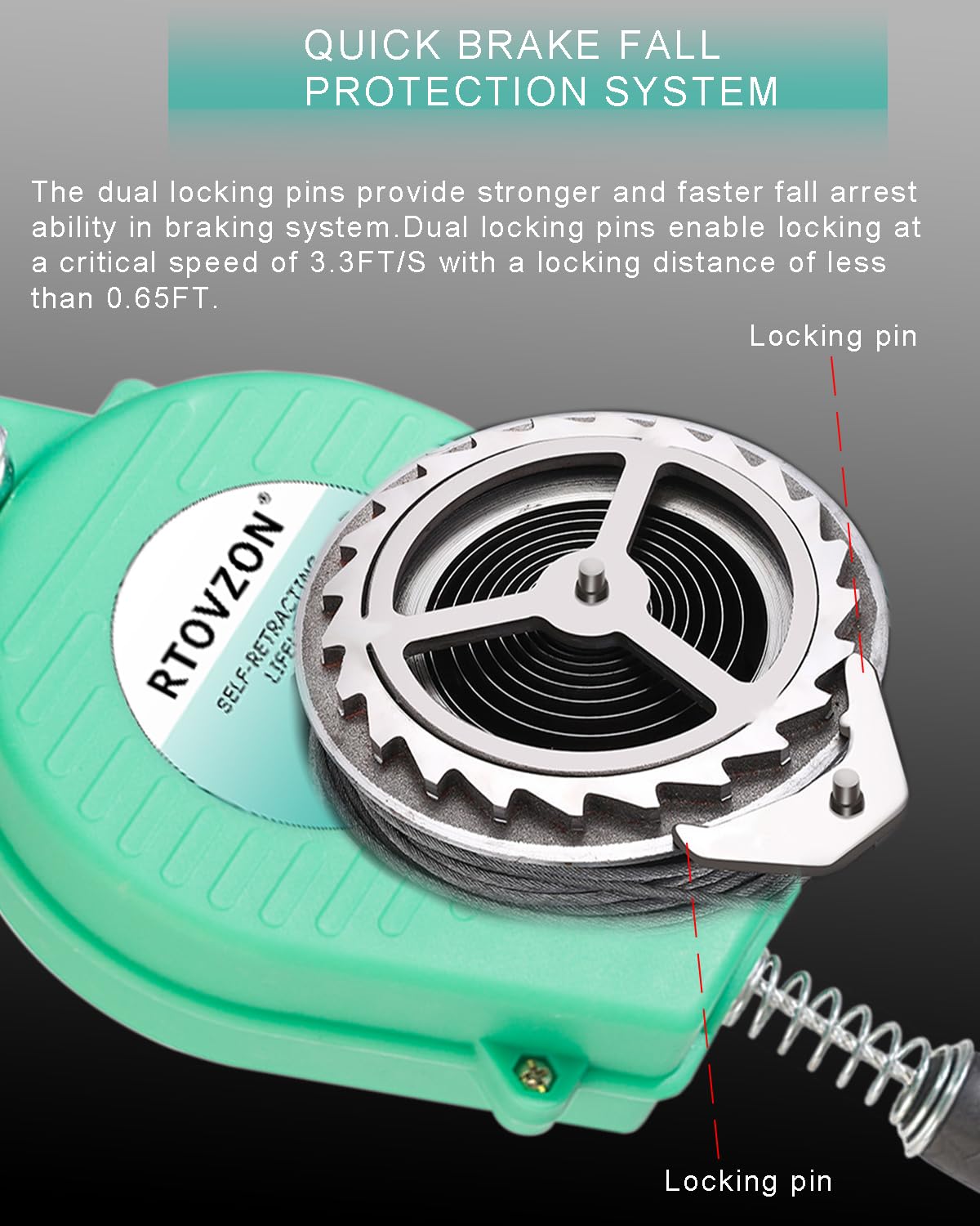 - 【QUICK BRAKE FALL PROTECTION SYSTEM】: The dual locking pins provide stronger and faster fall arrest ability in braking system. Dual locking pins enable locking at a critical speed of 3.3FT/S with a locking distance of less than 0.65FT.