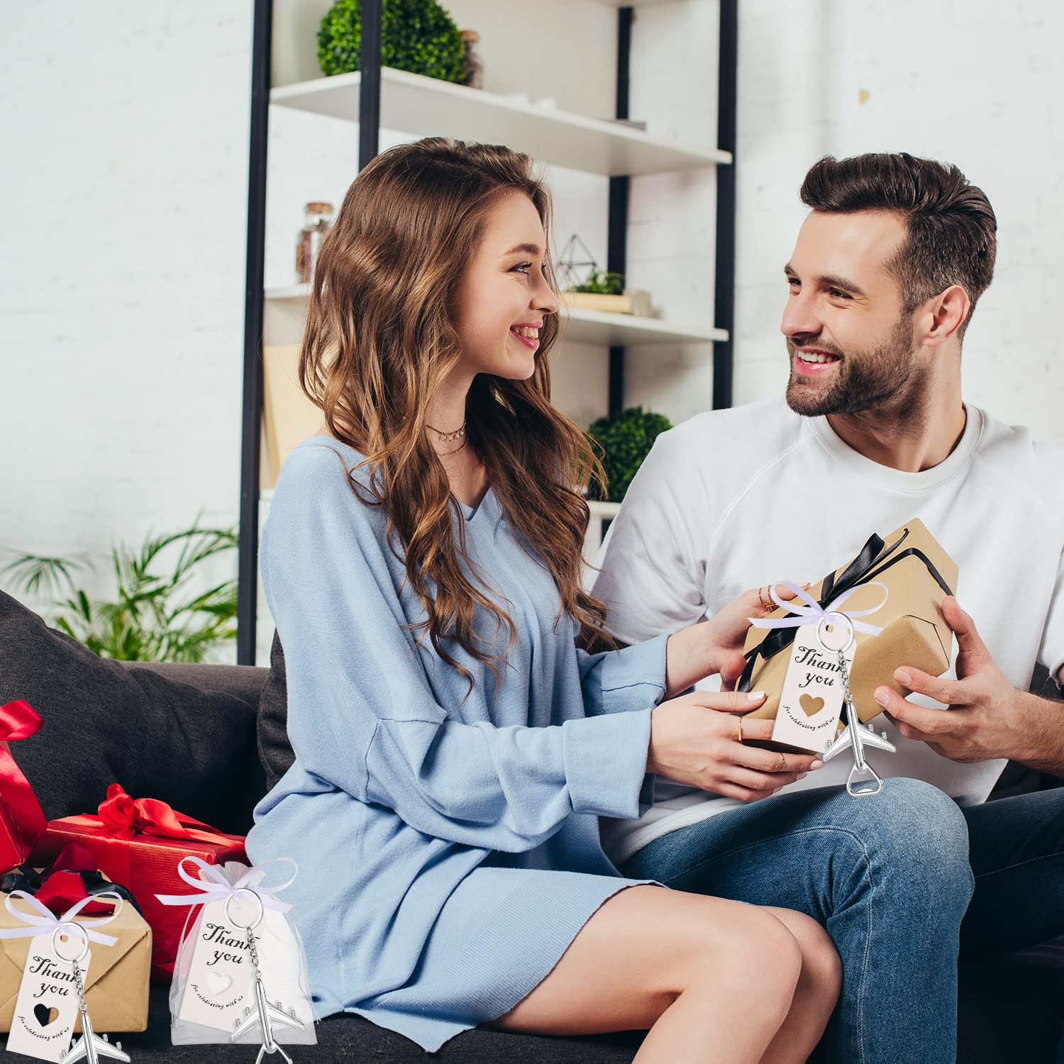 Details: 50Pcs Airplane Bottle Openers with Keychain & Keyrings for Wedding Favors, Bridal Shower Gifts for Guests or to make flight attendant gifts for a trip , Include White Sheer Favor Bag Thank You Card
