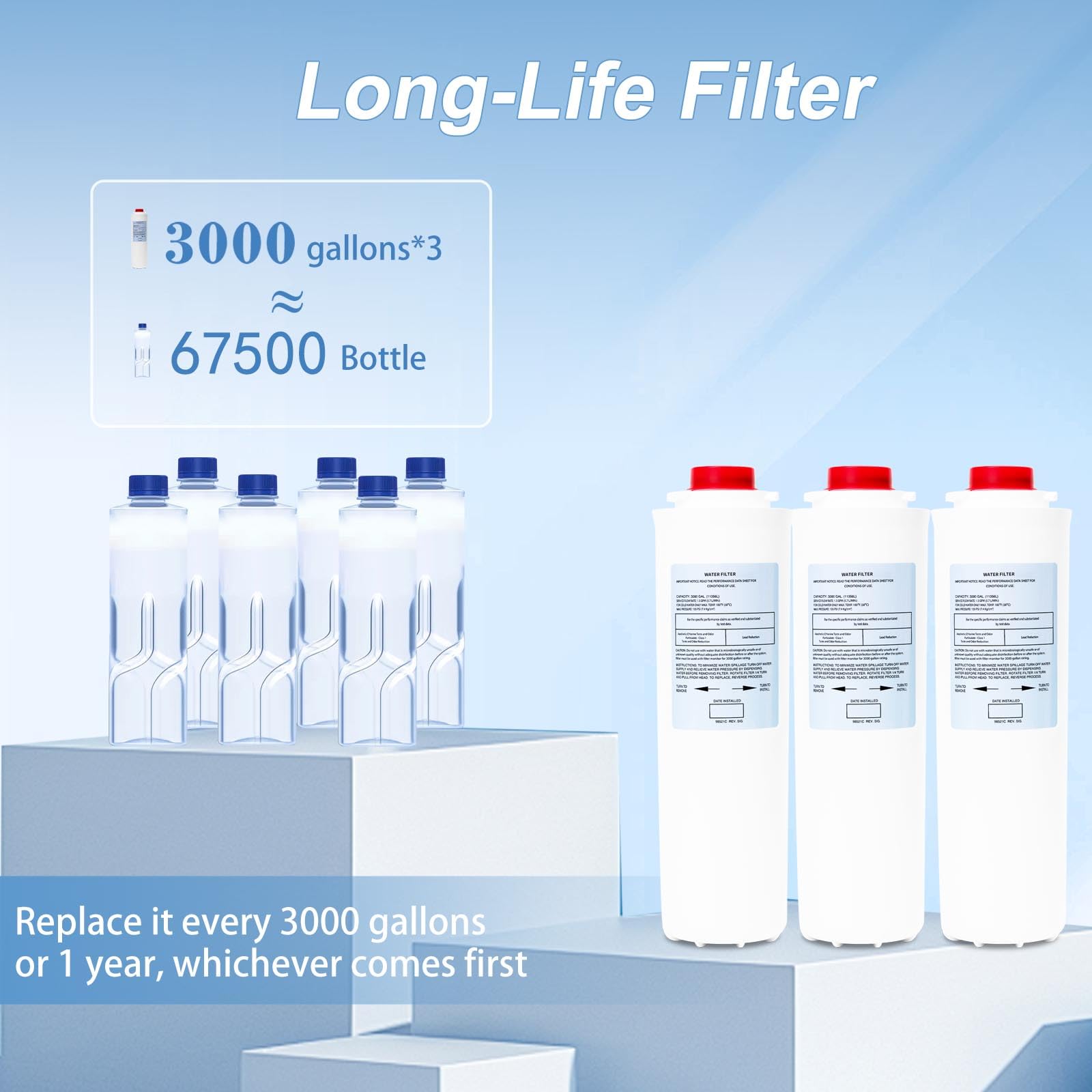 - Long-Life Filter: With a capacity of 3000 gallons per filter, we recommend replacing it every 3000 gallons or 1 year, whichever comes first