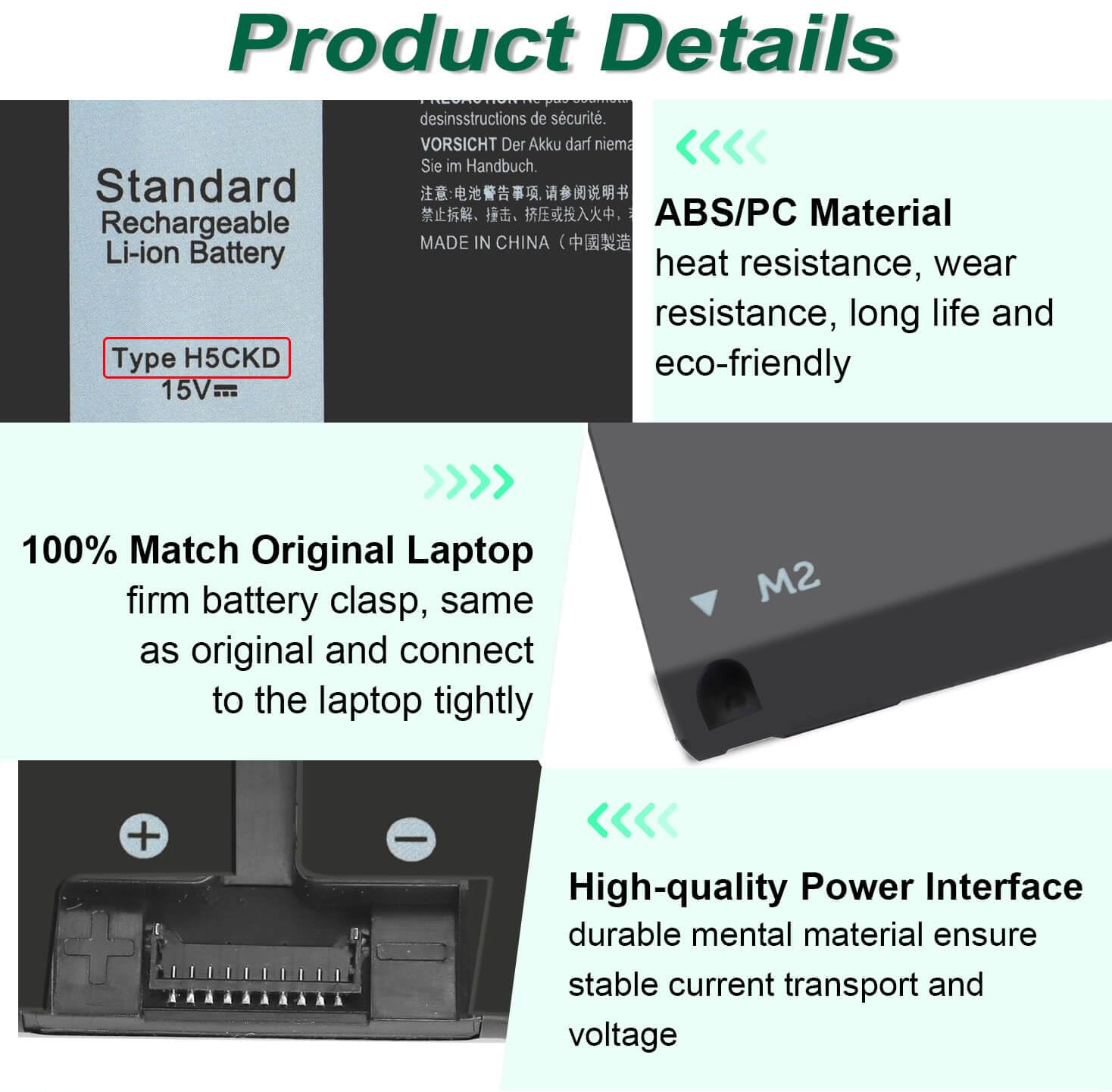 - Specifications: 53Wh Battery H5CKD , Battery Model: 53Wh Standard Rechargeable Li-ion battery Type H5CKD, Voltage: 15V Capacity: 53Wh ; Cells: 4-cell; Color: Black ,Packages includes: 1x H5CKD Battery,2 x Free Screwdrivers(Easy to Install),1x Instruction for Dell 53WH Type H5CKD Battery