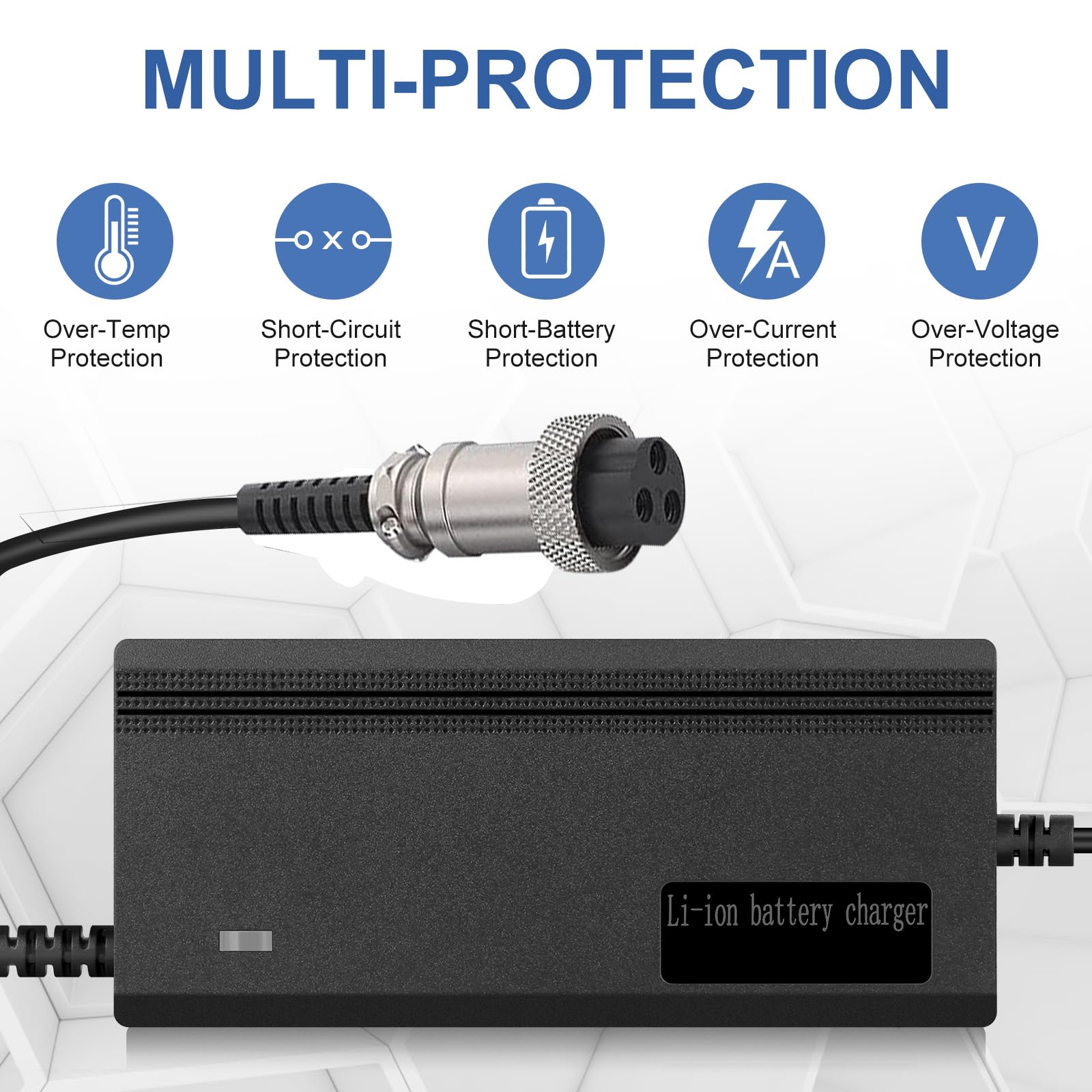 This 48V (54.6V 2A Max to Fully Charge a 48V Battery) charger uses a M16 3-Hole connector and has been optimized for use with 48V Lithium-ion batteries.