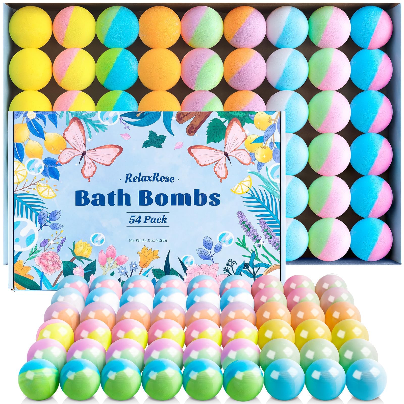 - 54 NATURAL BATH BOMBS: This RelaxRose set includes 54 bath bombs in 9 unique scents and 11 vibrant colors. Each scent enhances your mood, turning your bath into an aromatic journey. Enjoy a new and exciting experience with every bath. This large collection offers excellent value, providing countless relaxing baths and transforming your bathing experience into a spa-like retreat at home
