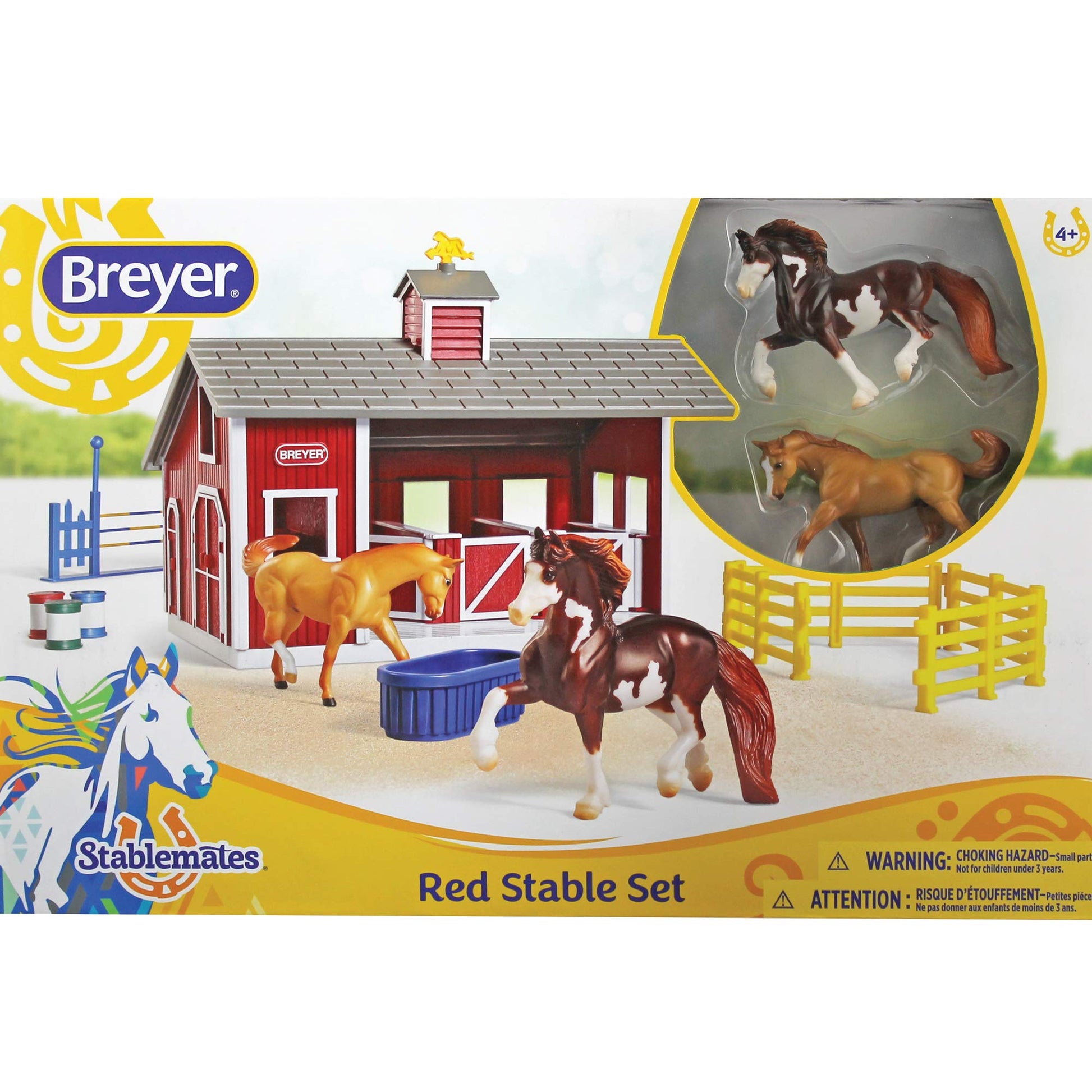 Horses need a stable for shelter. The 3.5-inch-long, 2-inch-tall horses included in this set are privileged to have such a wonderful red and white plastic stable. The barn snaps together in minutes and includes a tack and storage room and three stalls with swinging doors. Accessories such as a water trough, four corral fences, a jump, and three race barrels ensure fun-filled days for these lucky horses. The barn is 10.5 inches long, 6.5 inches wide, and 7 inches high. What a wonderful toy and display piece for horse lovers! --Tami Horiuchi