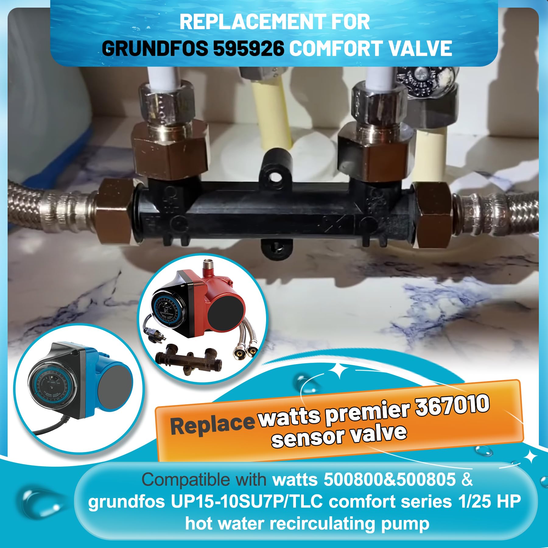 - Fit for grundfos & watts Recirculating Hot Water Pumps: The 595926 sensor valve replace watts premier 367010 bypass valve and compatible with watts recirculating hot water pump 500800&500805 and grundfos UP15-10SU7P/TLC comfort series 1/25 HP hot water recirculating pumps. The 595926 hot water recirculating valve is installed under the sink at the fixture furthest from the water heater.