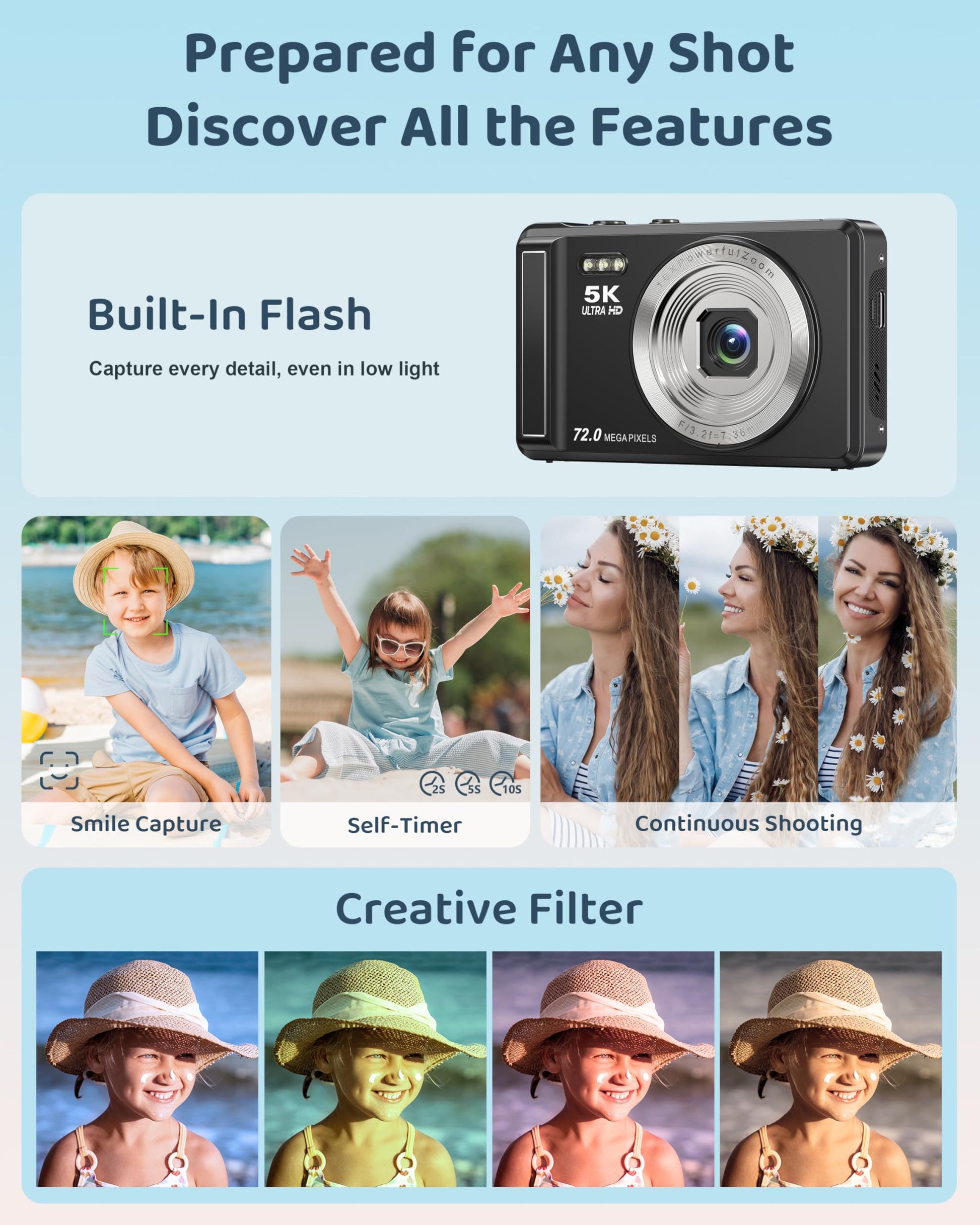 - UHD 5K 72MP Digital Camera - Capture stunning 5K ultra HD video and 72MP professional photos with this digital camera. The upgraded CMOS sensor ensures every detail is sharp, turning each moment into a vivid memory. With ultra-high resolution and smooth image quality, this 5K camera lets you shoot effortlessly—no complicated settings needed. Preserve your most unforgettable moments in stunning clarity