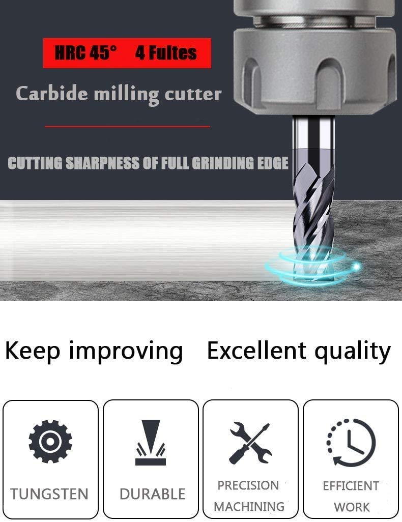 Details: Hunricho 5pcs 1/4”, 3/8”, 1/2”, 5/8”, 3/4” Carbide Square End Mill Material : HRC45° Carbide alloy steels Flute : 4 flutes Measuring system: Inch Package : 5pcs( 1/4”, 3/8”, 1/2”, 5/8”, 3/4” ) Coating : AlTiN. High hardness, good high temperature stability, low friction coefficient, etc. Advantage:High quality carbide alloy steels material , high performance for hard materials,Cutter is made of Micro Grain Carbide that is very tough, resists wear and offers high cutting performance.