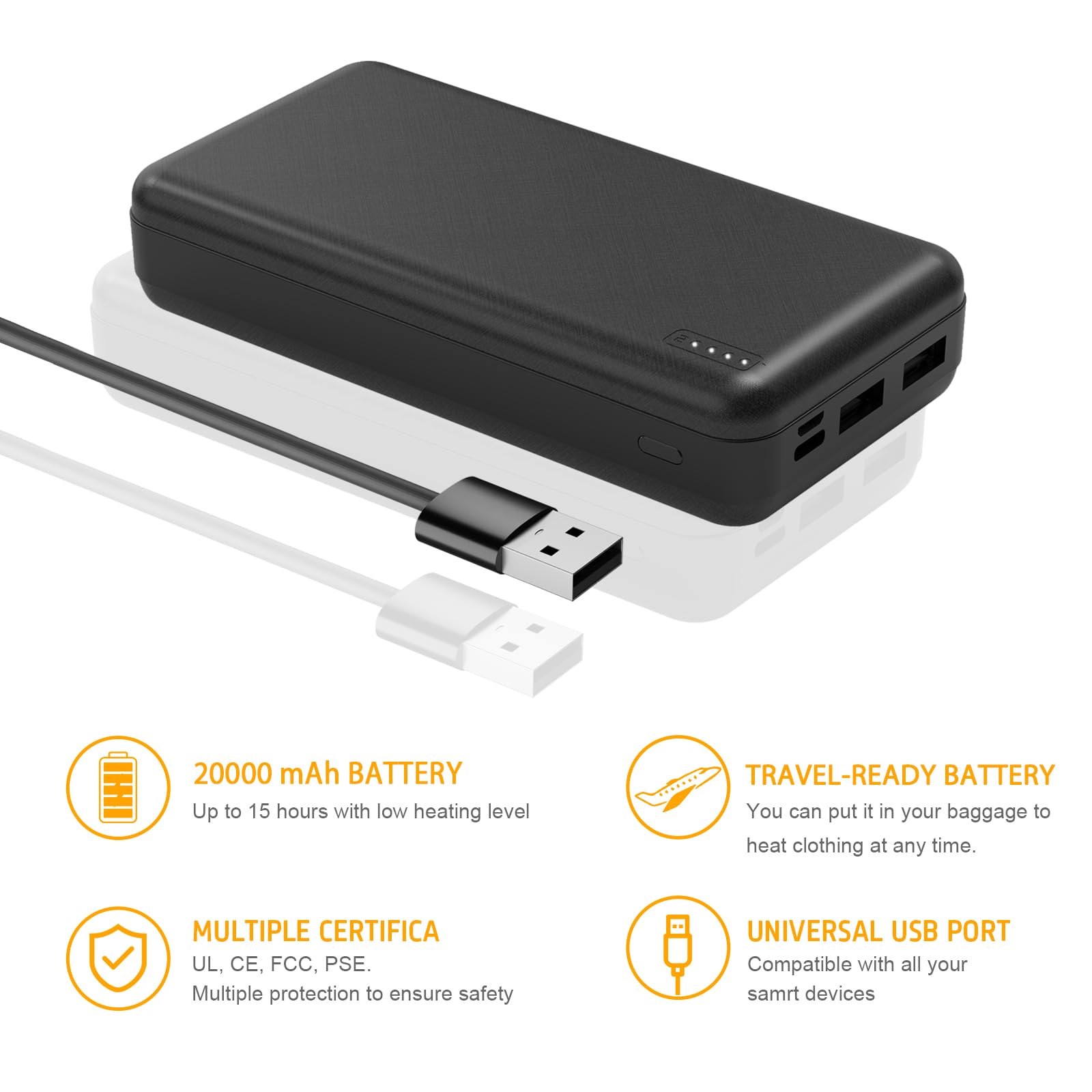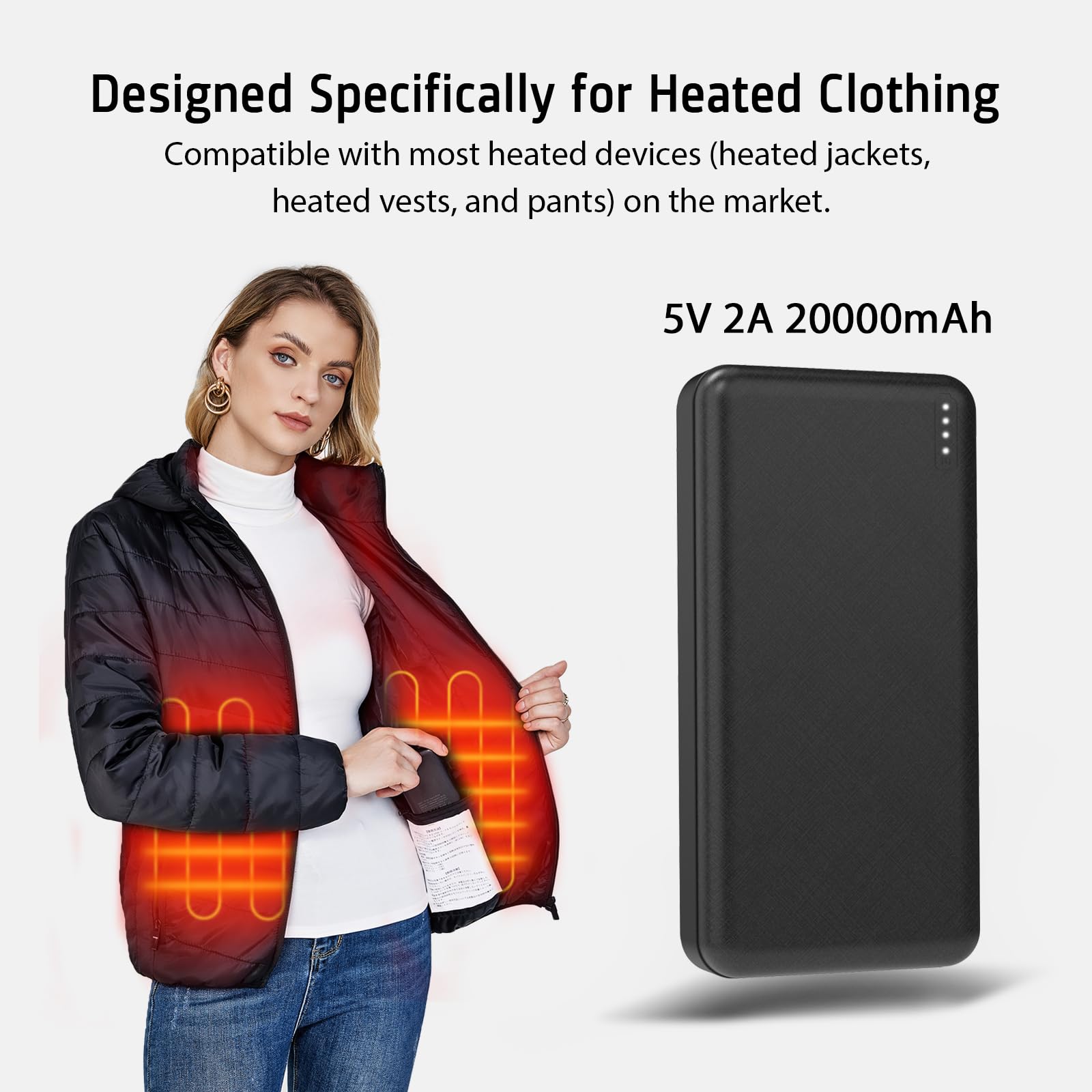 - 【Battery Pack Special for Heated Vests】20000mAh 5V2Alarge capacity, compatible with most heated devices (heated jackets, heating vests, and pants) on the market, and suitable for charging smart phones.
