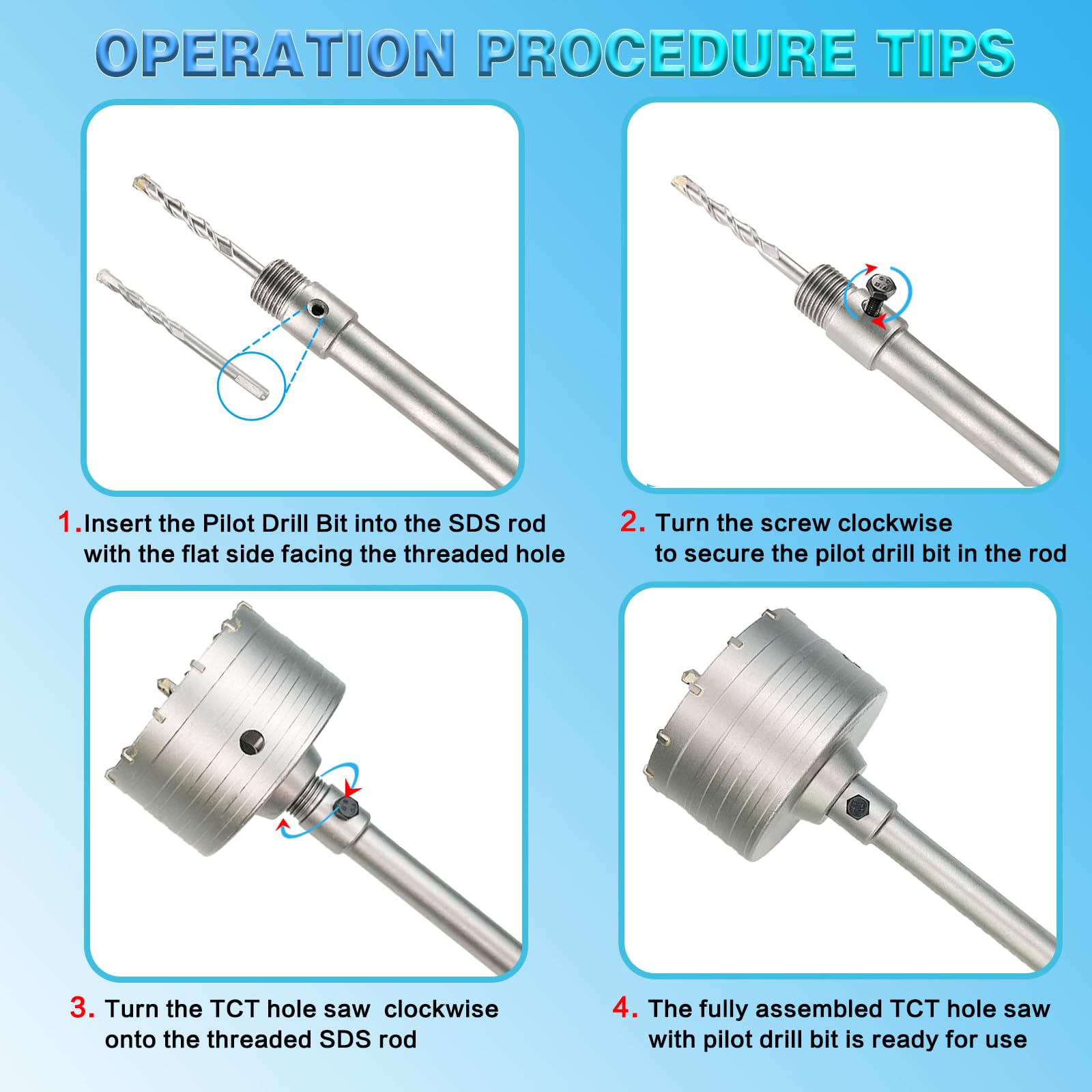 The kit includes a 220mm SDS Plus shank connecting rod and 2-piece of 110mm center positioning drill bit, enabling precise and stable drilling through cinderblocks, bricks, and adobe walls. Its triple-edged, razor-sharp teeth cut quicklyand efficiently, while internal and external grooves guide chips outward for a clean operational experience.