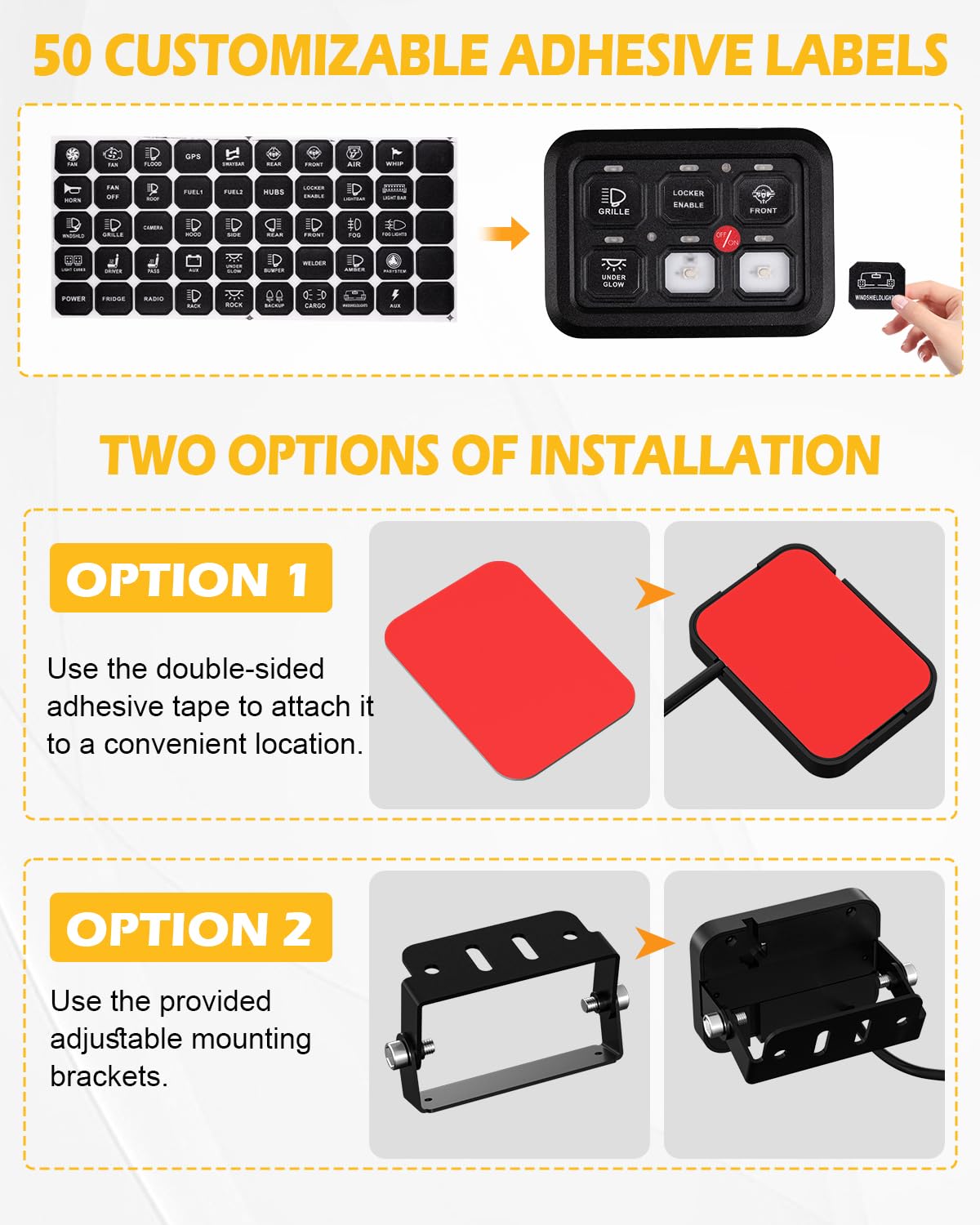 - 【Easy Installation】Plug-and-play wiring harness ensures easy connection of LED lights or accessories, greatly saving installation time. Two mounting brackets are provided to meet different installation needs. The clean and neat exterior design eliminates the need for complex wiring, keeping the cabin tidy and beautiful. 50 self-adhesive labels are provided for users to customize the personalized switch panel.