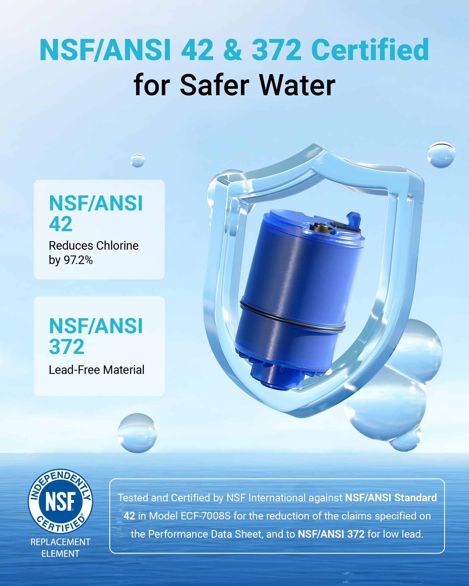 - 【NSF certifications】Tested and certified by NSF International against NSF/ANSI standard 42 for the reduction of chlorine, taste and odor, and to NSF/ANSI 372 for lead-free material. For detailed NSF certification information: Visit the NSF official website, type " AQU-CF08A" into "Brand name/ Trade name/ Model" bar and click the "Search" button.