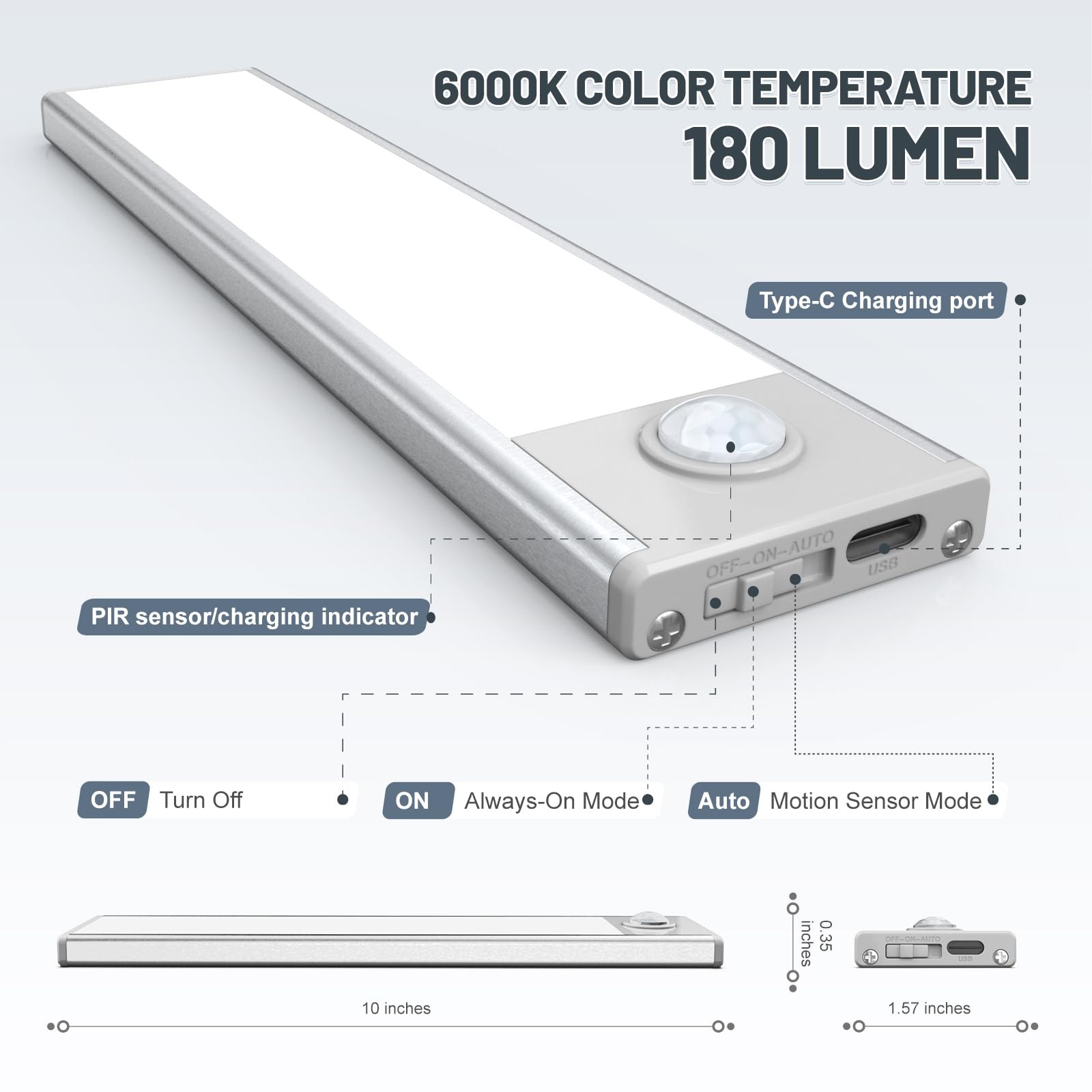 - USB-C Rechargeable Under Cabinet Lighting Wireless: These cabinet lights have a built-in 2000mAh rechargeable battery, which can be quickly recharged with a Type-C cable. No need to worry about wiring like other models, they can be quickly charged via a Type-C cable. The closet lights can be used for approximately 5 to 6 hours of continuous use and up to 7 to 20 days in motion-sensing mode (depending on how often you use them). (Charge before first use.) Full charge in 1-2 hours