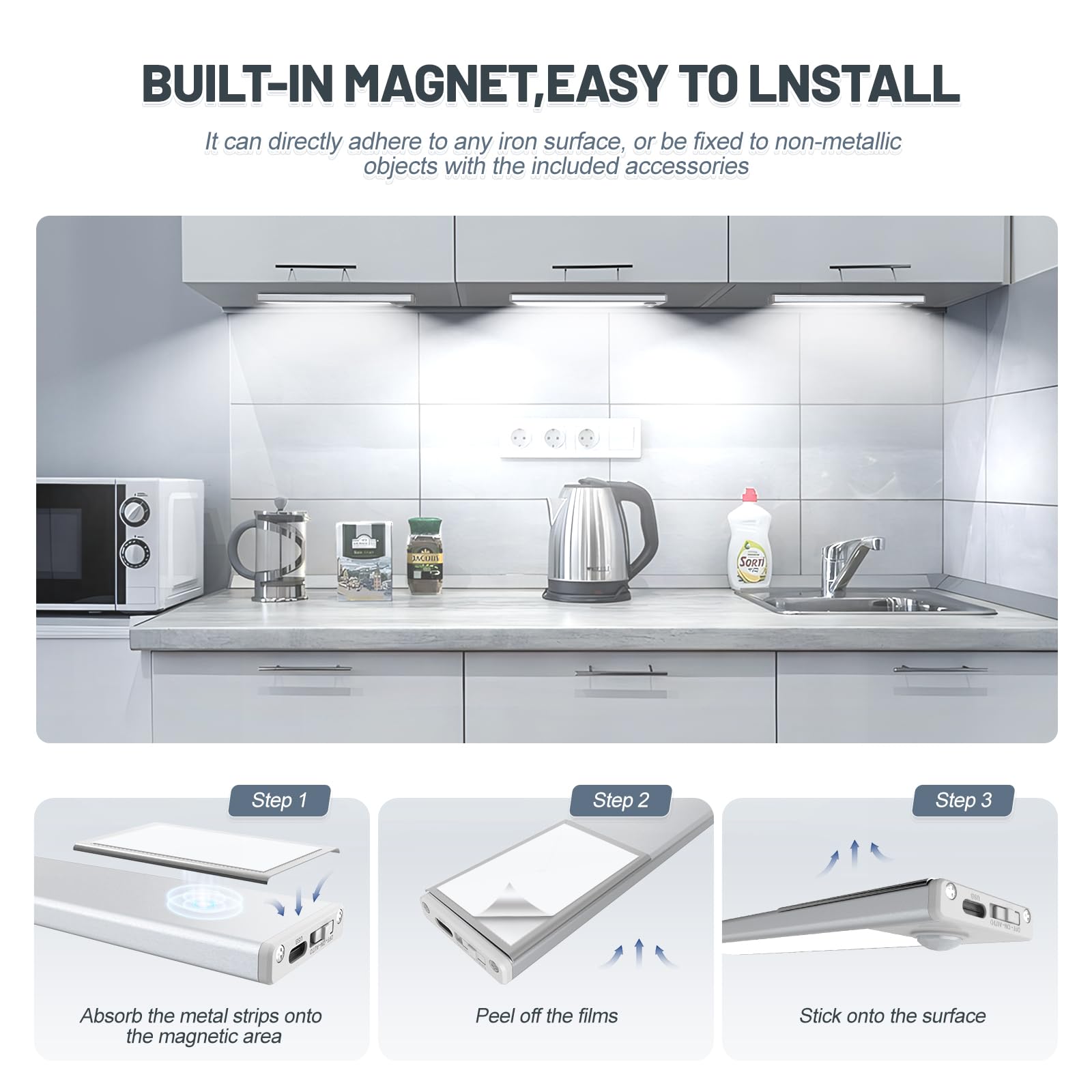 - Versatile and easy to install: the under cabinet lights are built-in super strong magnets, easy to install. It can be directly attached to any iron surface. Or use the included metal adhesive to stick it anywhere you want. Cabinet lights wireless for kitchen, bedroom, closet, cabinet, storage room, basement, stairs, corridor and so on. Easy to remove and reinstall when the cabinet light needs to be recharged