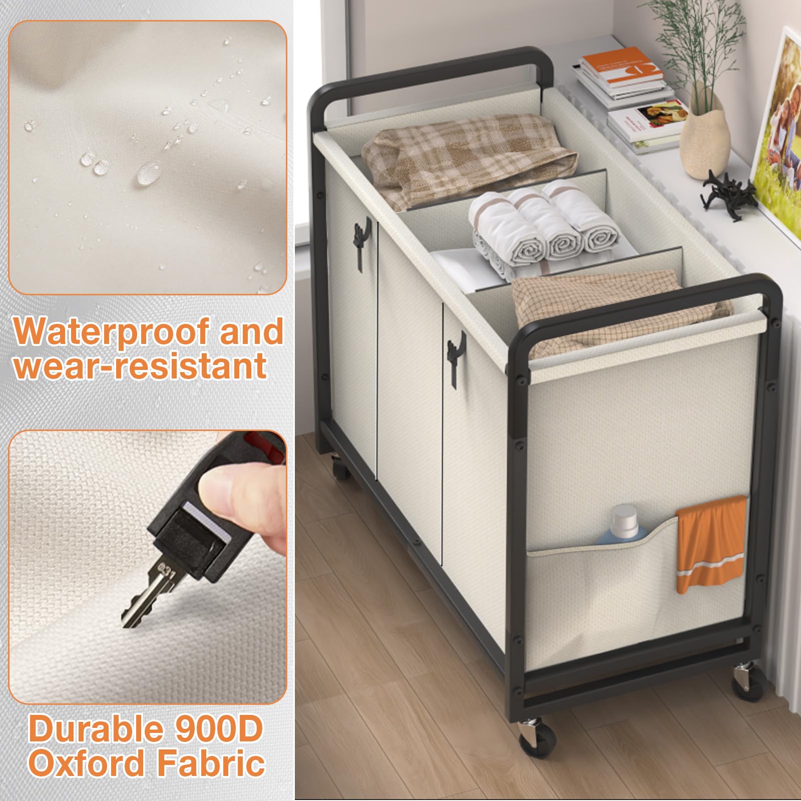 - 【Stylish & Practical 】This 3-section laundry sorter with lid made from 900D Oxford fabric with a tear-proof, waterproof PVC liner, this rolling laundry sorter is built to last 15+ years. The laundry basket is the perfect blend of modern design and practicality, making it an ideal addition to any home