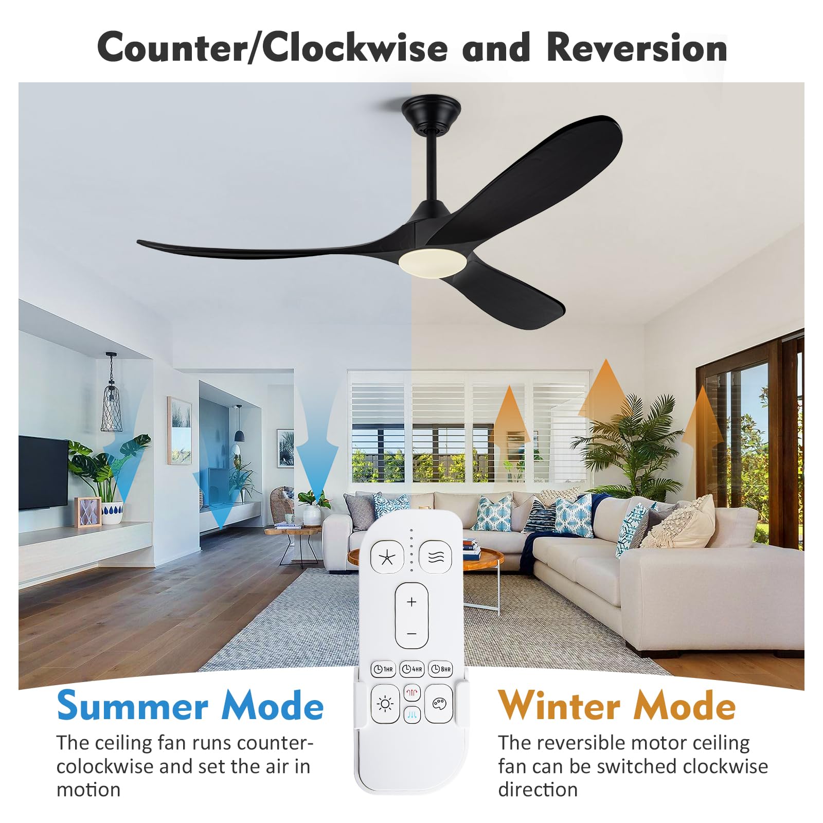 - 【Summer Winter Reversible Ceiling Fan】Modern indoor ceiling fan with light has forward and reverse switch, allows us to change the 60 inch fans direction seasonally. Winter, press the reverse switch, the upward airflow circulates the warm air produced by the room's heating equipment and keeps room warm. Summer, the downward airflow creates a wind-cooling effect, keeping room cool.