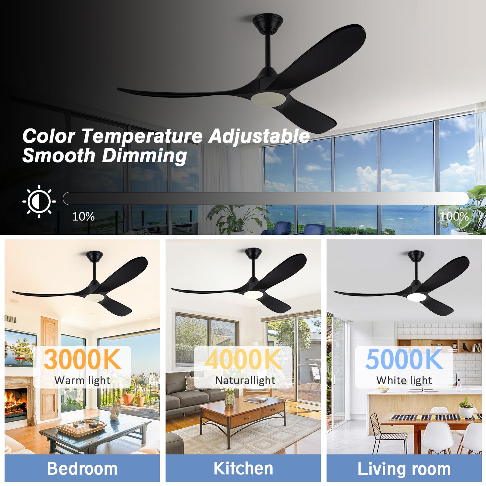 - 【Quiet High CFM Ceiling Fan】Modern black ceiling fans use silent energy-saving DC motors, large airflow up to 6210 CFM, ultra-quiet, noise is less than 30 db, no humming sound! Providing a great shopping experience. 3 adjustable color temperature settings (Warm 3000K/ Natural 4000K/ Cold 5000K) , 10%-100% adjustable brightness and a light memory function. Acrylic cover with flicker-free LED light source can make the light more soft.