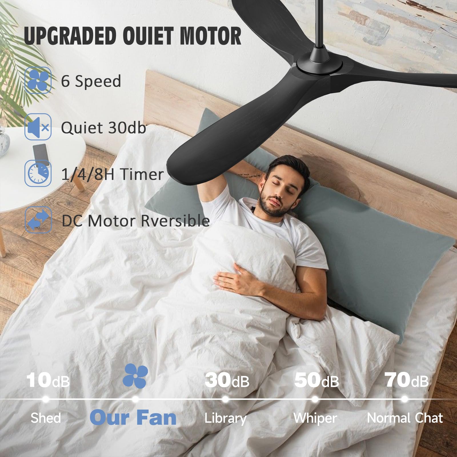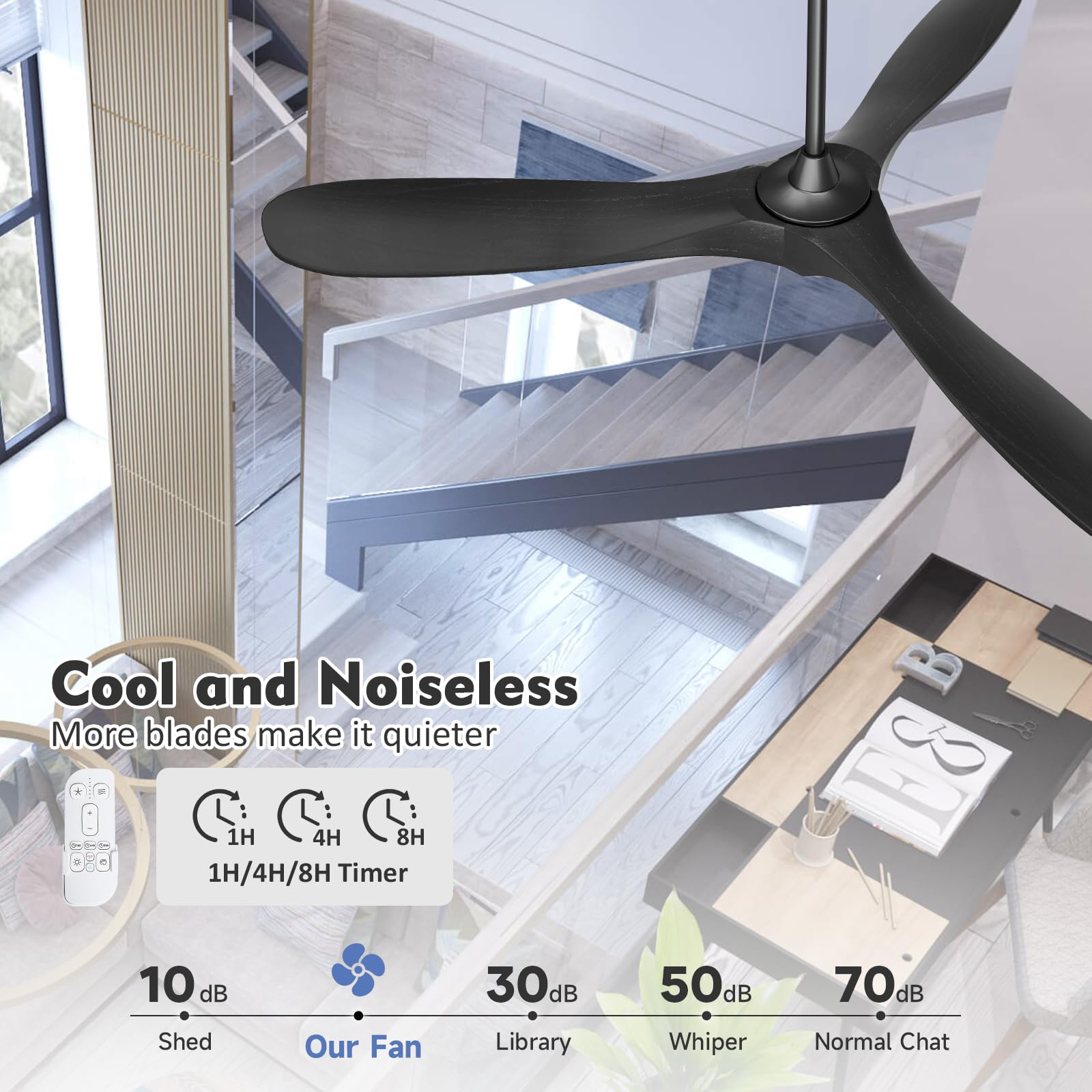 - 【60" Black Ceiling Fan with Light and Remote】Low profile indoor outdoor ceiling fan has 3 carved solid walnut wood fan blades and integrated in a modern design, which is not only beautiful and unique, but also provides a more uniform wind distribution, so that the entire room can enjoy a comfortable wind. Minimalist style and vintage texture of natural solid wood make the wood propeller ceiling fan an eye-catching home improvement ceiling fan.