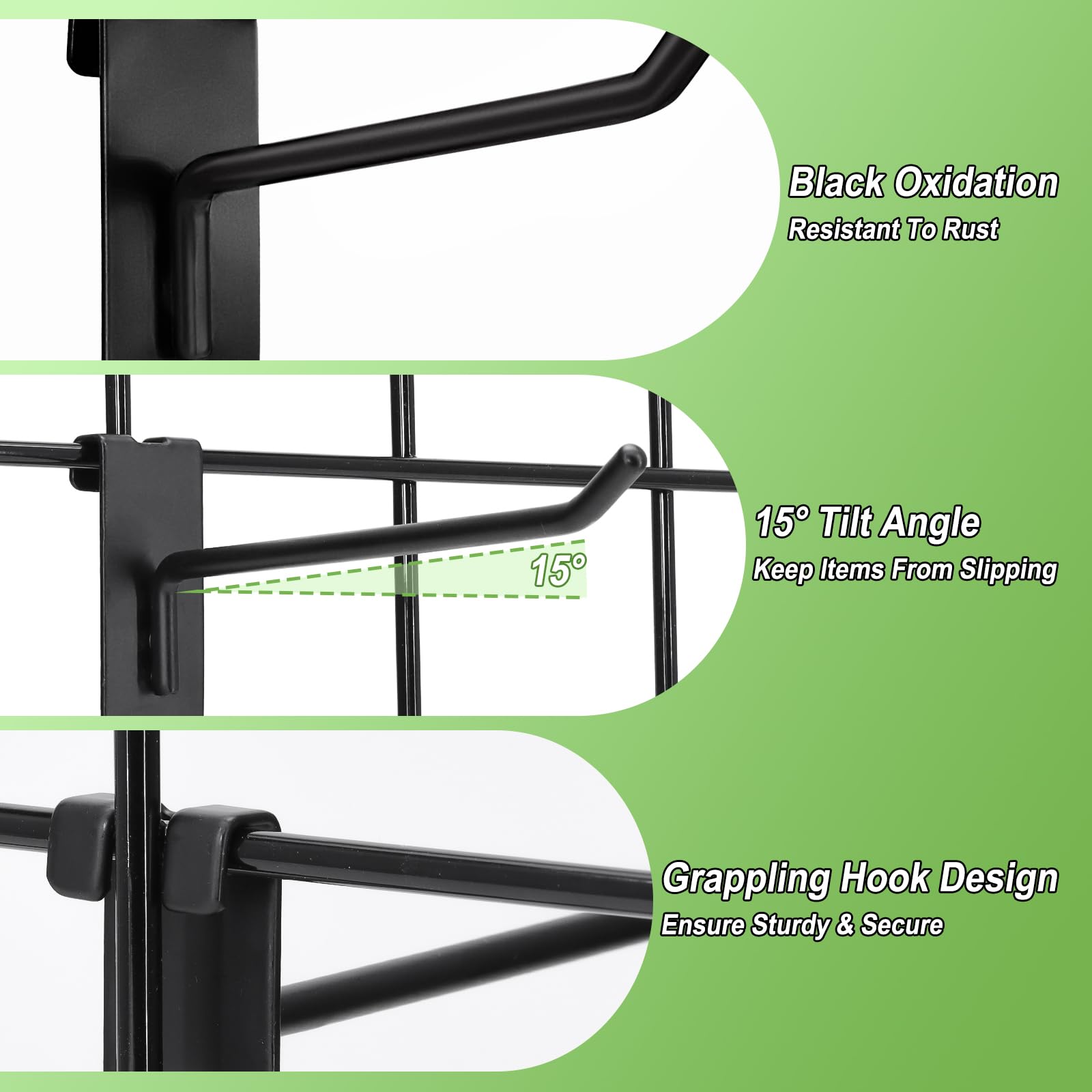 - 15° Tilt Angle & Black Oxidation: Featuring a clever 15° tilt, our hooks are specifically engineered to prevent items from slipping or falling. Crafted with black oxidation paint, the hook features a smooth surface while ensuring your displayed goods remain upright