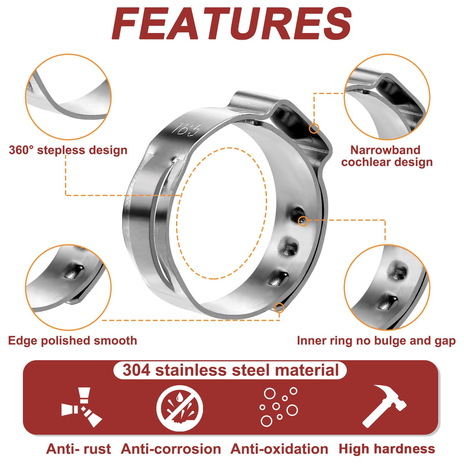 - โ [๐๐๐ยฐ๐๐ญ๐๐ฉ๐ฅ๐๐ฌ๐ฌ ๐๐๐๐ฅ] Narrow band design providing a more concentrated sealing pressure. The edge of all stepless ear clamps are polished smooth, not damage the hose. Perfect seal and no skin catching metal sticking up