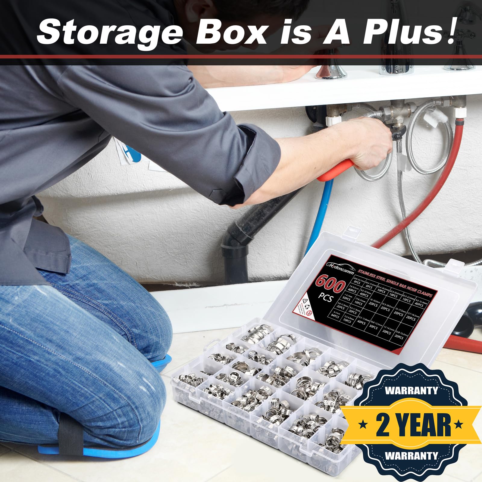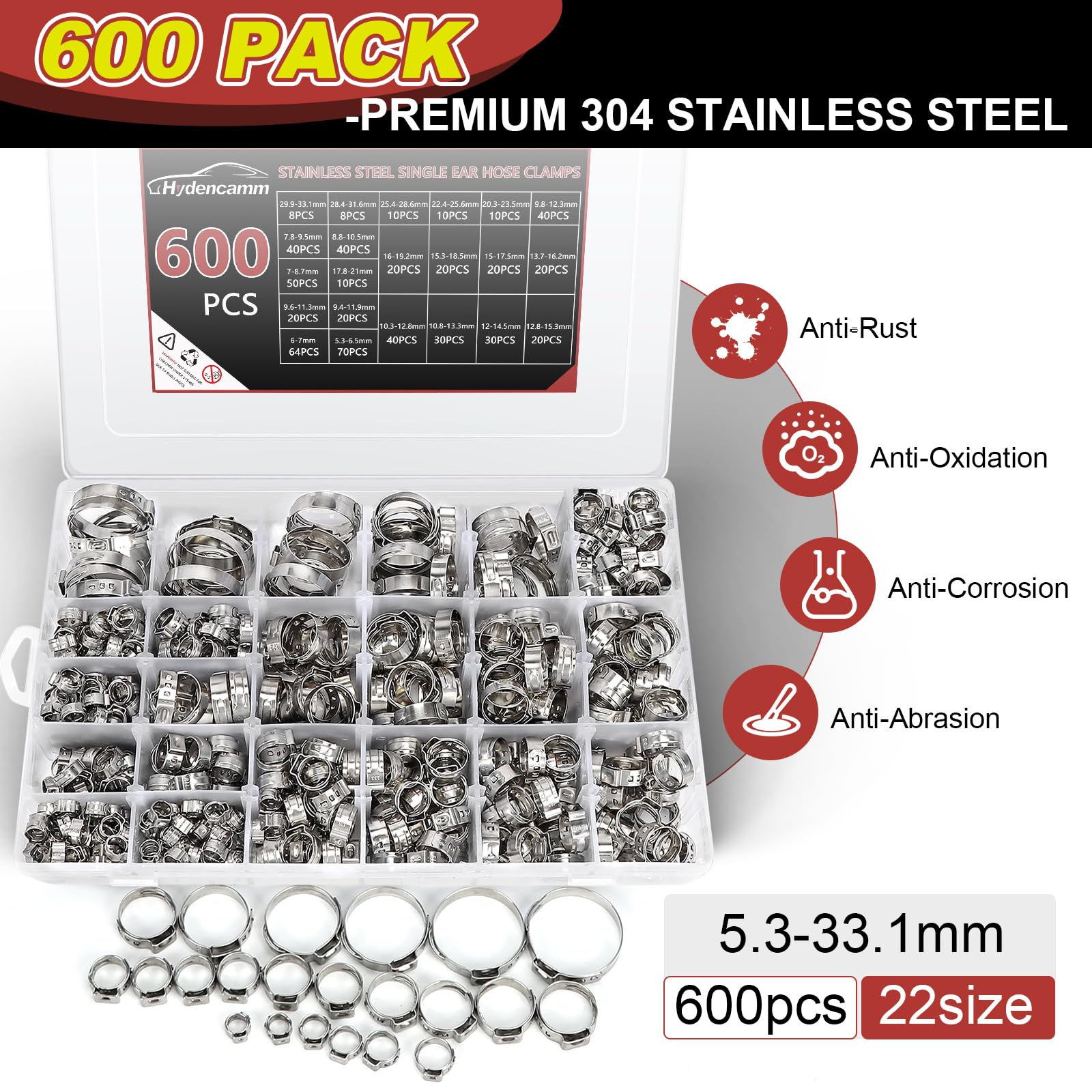 600PCS 22 Sizes Single Ear Hose Clamps, 5.3-33.1mm Crimp Hose Clamps 304 Stainless Steel, Ear Clamp Perfect for Automotive, Home Appliance Line, Pipe Hoses and Industry Use By Hydencamm